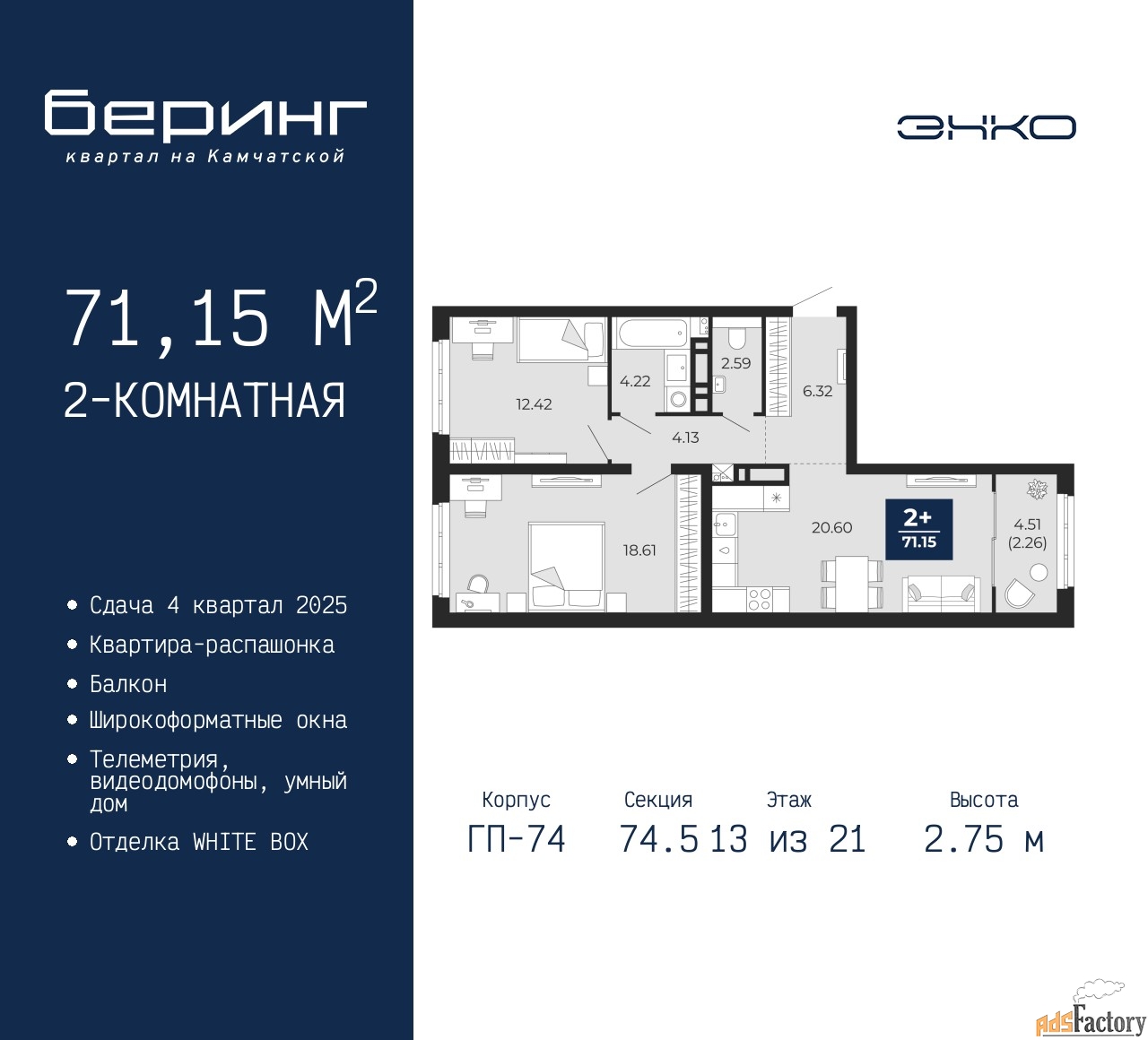 Дом монолитный, многоподъездный, переменной этажности, от 9 до 21 этажей. Квартира находится в 74.5-й секции высотой 21 этаж в корпусе ГП-74. На этаже 7 квартир. В подъезде 1 пассажирский и 1 грузовой лифт. Окончание строительства - 4 квартал 2025 года. Оформление сделки по договору долевого участия.
