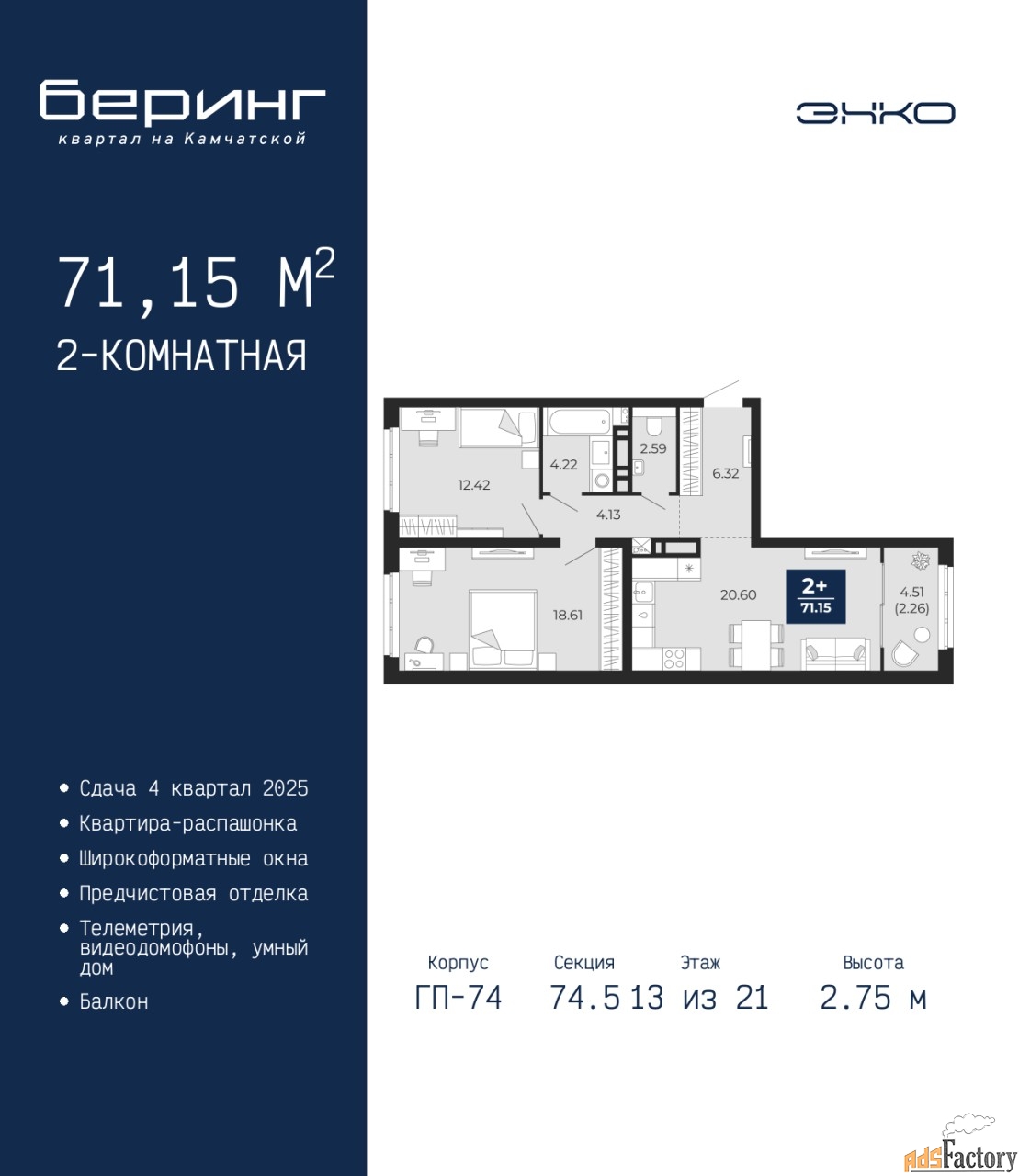 Дом монолитный, многоподъездный, переменной этажности, от 9 до 21 этажей. Квартира находится в 74.5-й секции высотой 21 этаж в корпусе ГП-74. На этаже 7 квартир. В подъезде 1 пассажирский и 1 грузовой лифт. Окончание строительства - 4 квартал 2025 года. Оформление сделки по договору долевого участия.