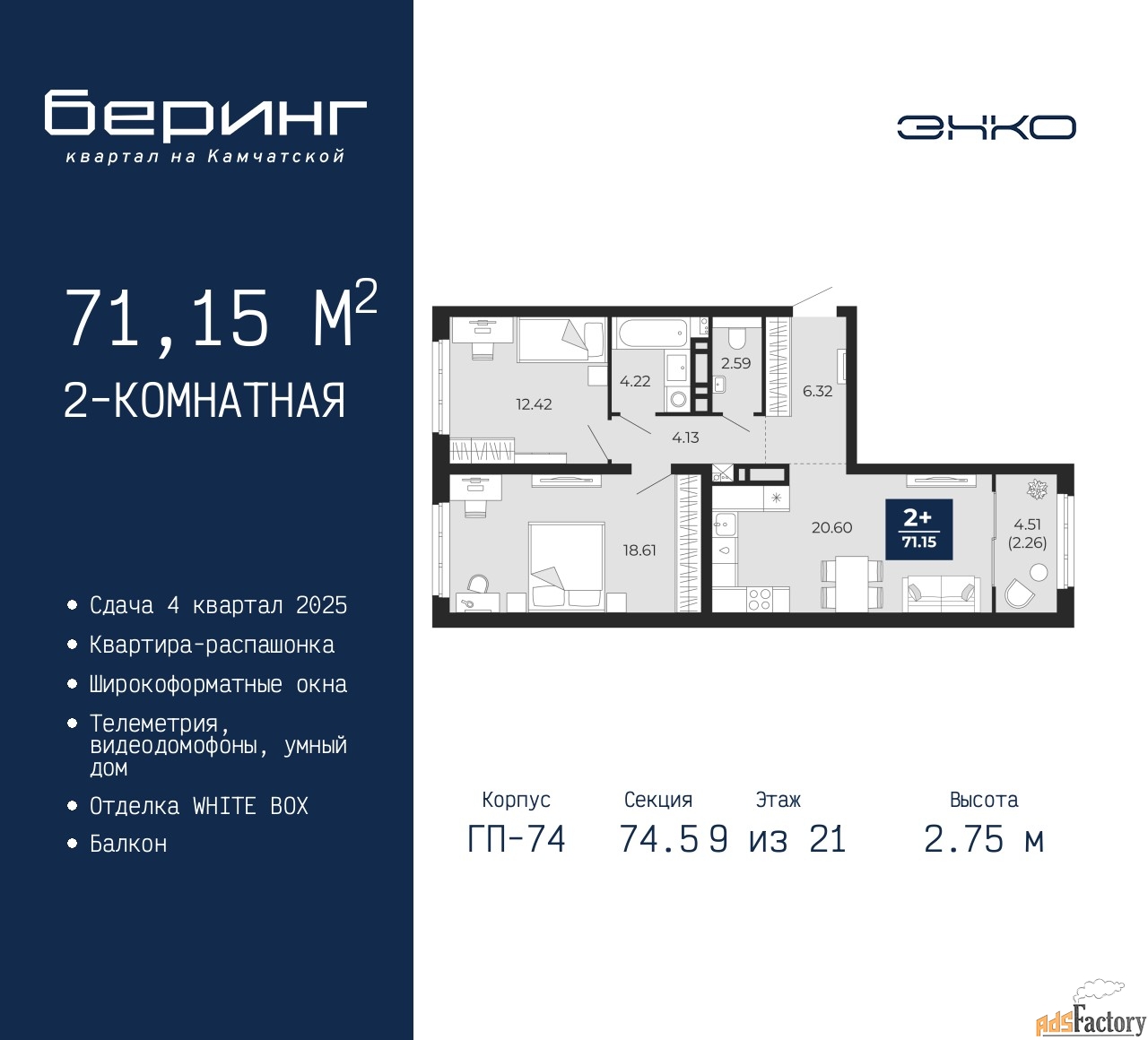 Дом монолитный, многоподъездный, переменной этажности, от 9 до 21 этажей. Квартира находится в 74.5-й секции высотой 21 этаж в корпусе ГП-74. На этаже 7 квартир. В подъезде 1 пассажирский и 1 грузовой лифт. Окончание строительства - 4 квартал 2025 года. Оформление сделки по договору долевого участия.