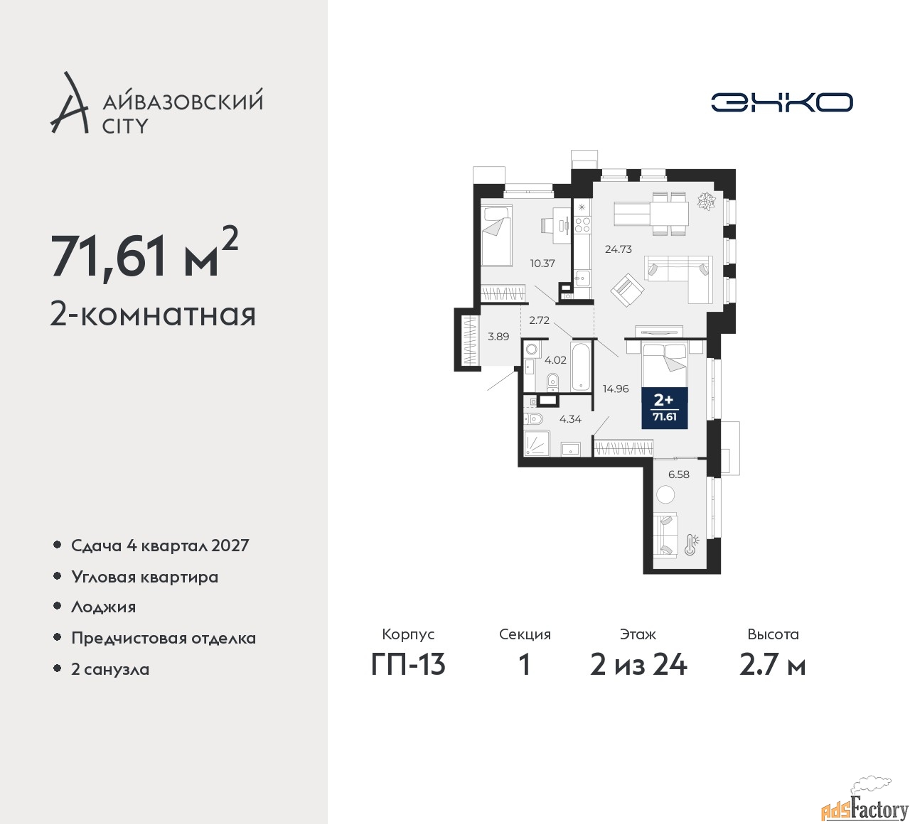 Дом монолитный, многоподъездный, высотой 24 этажа. Квартира находится в 1-й секции в корпусе ГП-13. На этаже 2 квартиры. Окончание строительства - 4 квартал 2027 года. Оформление сделки по договору долевого участия.