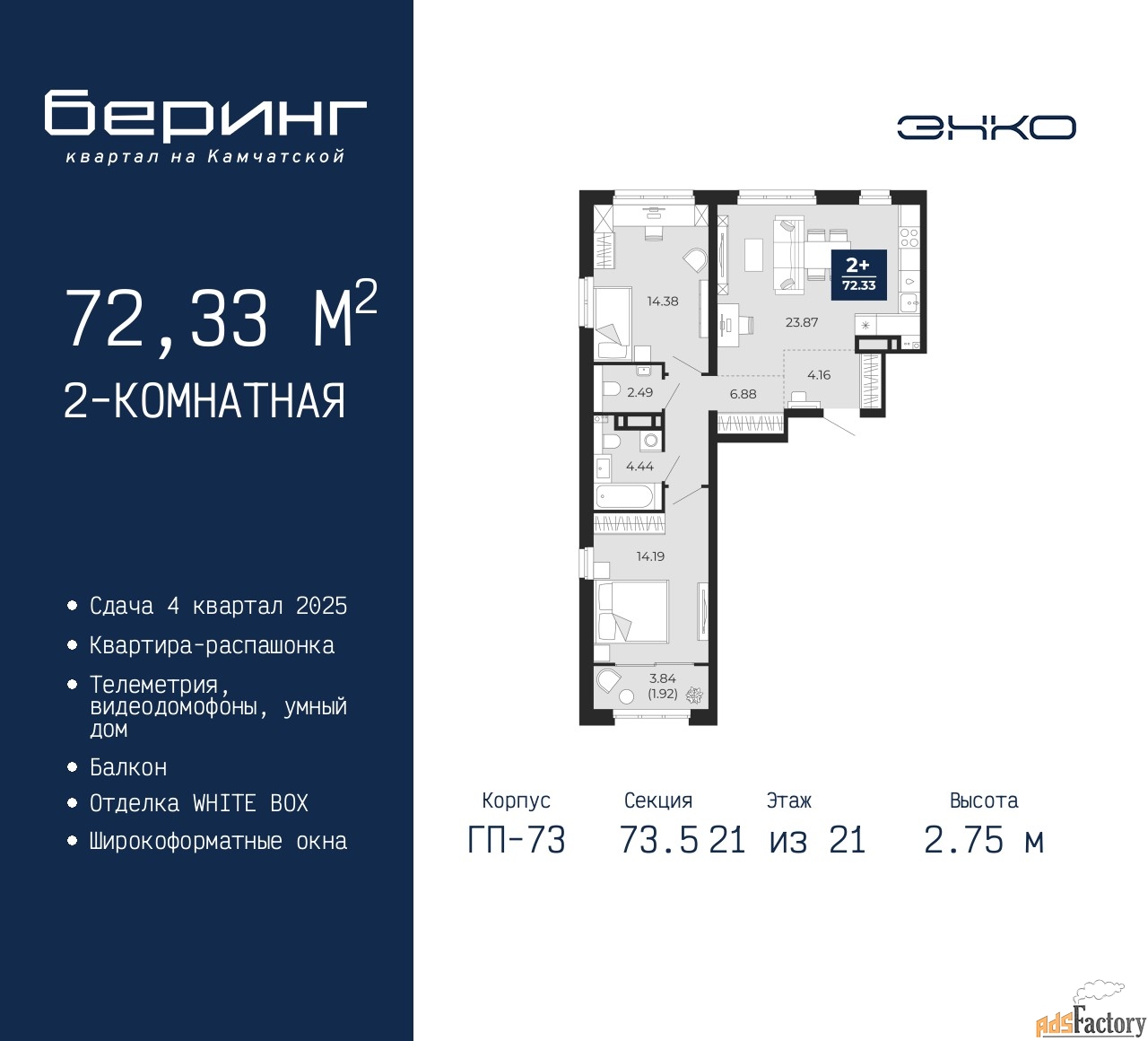 Дом монолитный, многоподъездный, переменной этажности, от 9 до 22 этажей. Квартира находится в 73.5-й секции высотой 21 этаж в корпусе ГП-73. На этаже 6 квартир. В подъезде 1 пассажирский и 1 грузовой лифт. Окончание строительства - 4 квартал 2025 года. Оформление сделки по договору долевого участия.
