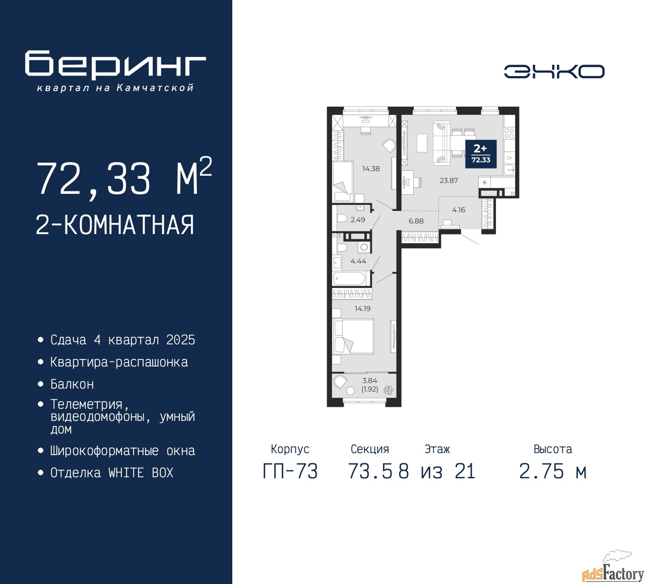 Дом монолитный, многоподъездный, переменной этажности, от 9 до 22 этажей. Квартира находится в 73.5-й секции высотой 21 этаж в корпусе ГП-73. На этаже 6 квартир. В подъезде 1 пассажирский и 1 грузовой лифт. Окончание строительства - 4 квартал 2025 года. Оформление сделки по договору долевого участия.