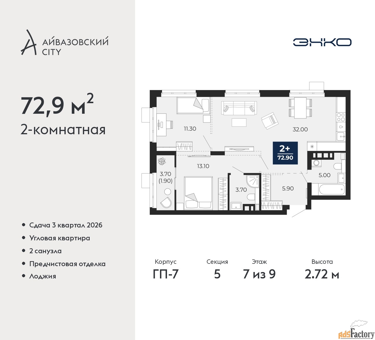 Дом монолитный, многоподъездный, переменной этажности, от 9 до 24 этажей. Квартира находится в 5-й секции высотой 9 этажей в корпусе ГП-7. На этаже 7 квартир. В подъезде 1 пассажирский и 2 грузовых лифта. Окончание строительства - 3 квартал 2026 года. Оформление сделки по договору долевого участия.