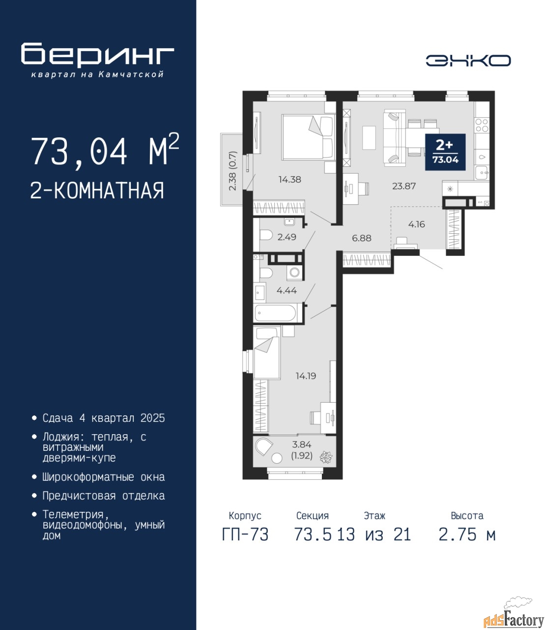 Дом монолитный, многоподъездный, переменной этажности, от 9 до 22 этажей. Квартира находится в 73.5-й секции высотой 21 этаж в корпусе ГП-73. На этаже 6 квартир. В подъезде 1 пассажирский и 1 грузовой лифт. Окончание строительства - 4 квартал 2025 года. Оформление сделки по договору долевого участия.