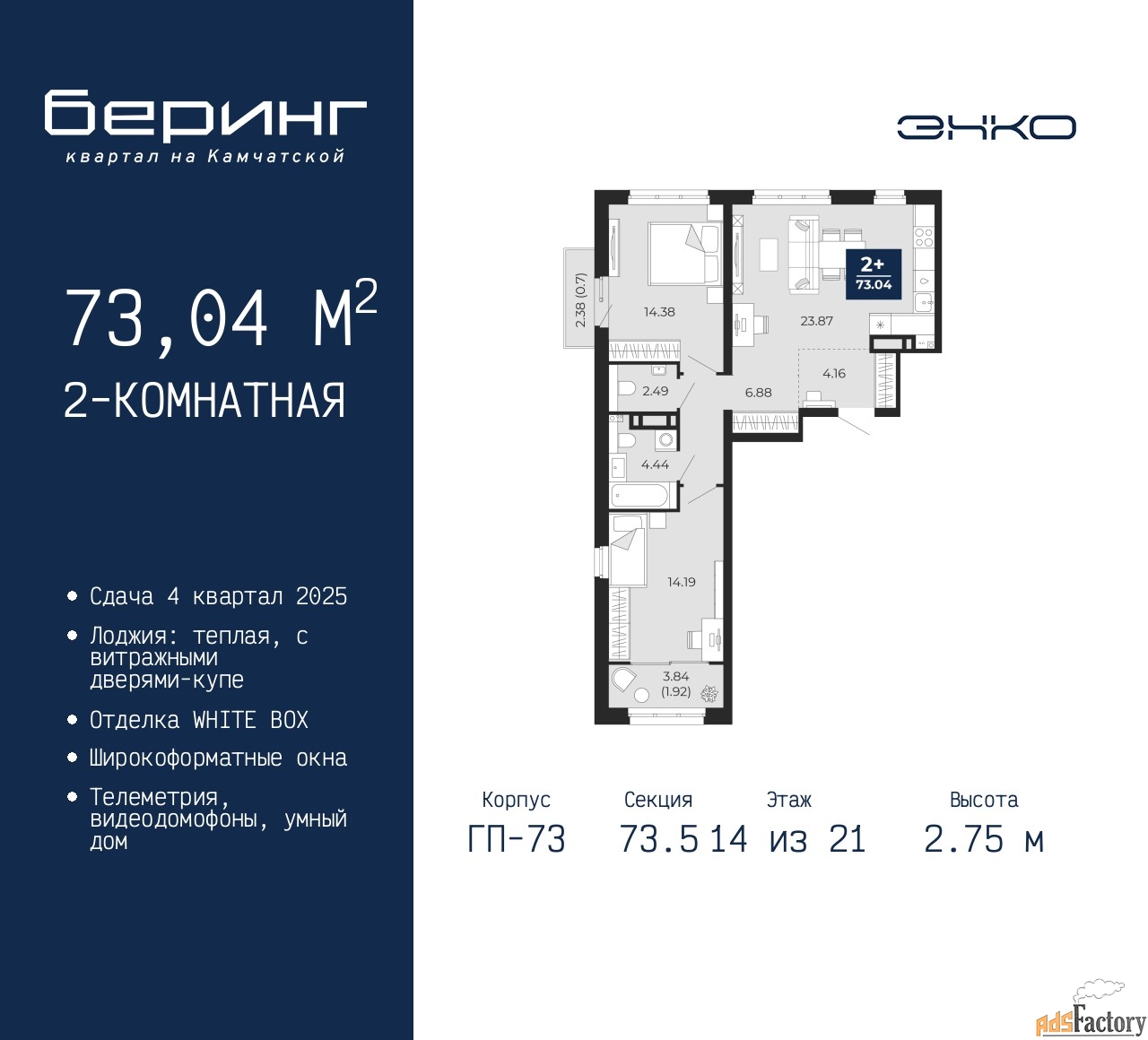 Дом монолитный, многоподъездный, переменной этажности, от 9 до 22 этажей. Квартира находится в 73.5-й секции высотой 21 этаж в корпусе ГП-73. На этаже 6 квартир. В подъезде 1 пассажирский и 1 грузовой лифт. Окончание строительства - 4 квартал 2025 года. Оформление сделки по договору долевого участия.