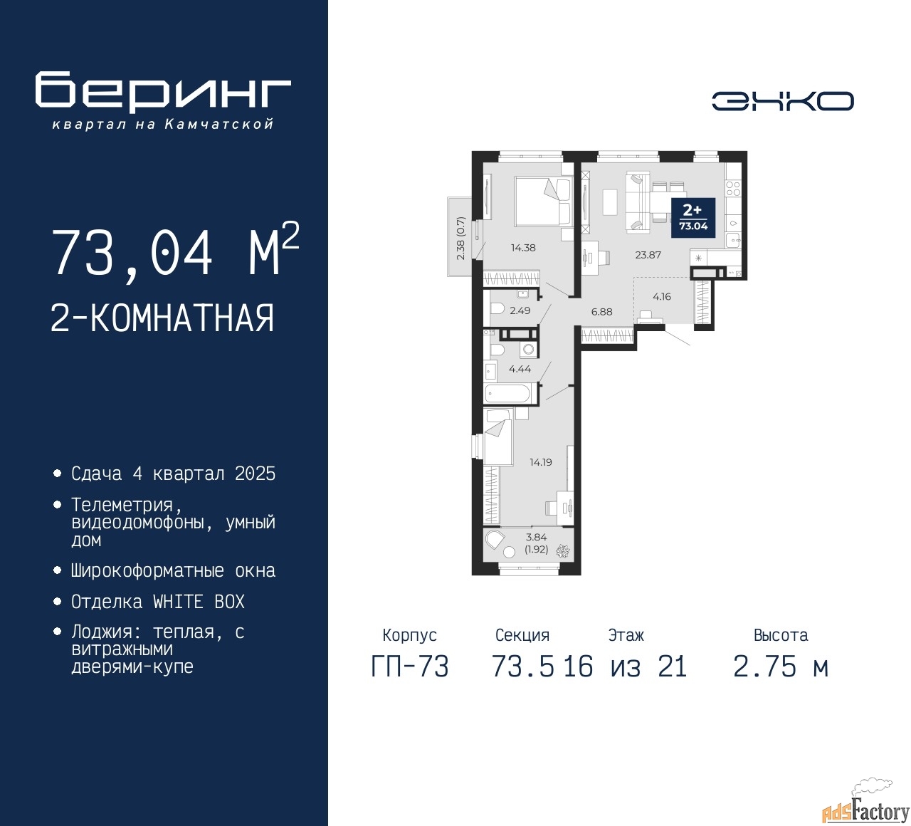 Дом монолитный, многоподъездный, переменной этажности, от 9 до 22 этажей. Квартира находится в 73.5-й секции высотой 21 этаж в корпусе ГП-73. На этаже 6 квартир. В подъезде 1 пассажирский и 1 грузовой лифт. Окончание строительства - 4 квартал 2025 года. Оформление сделки по договору долевого участия.