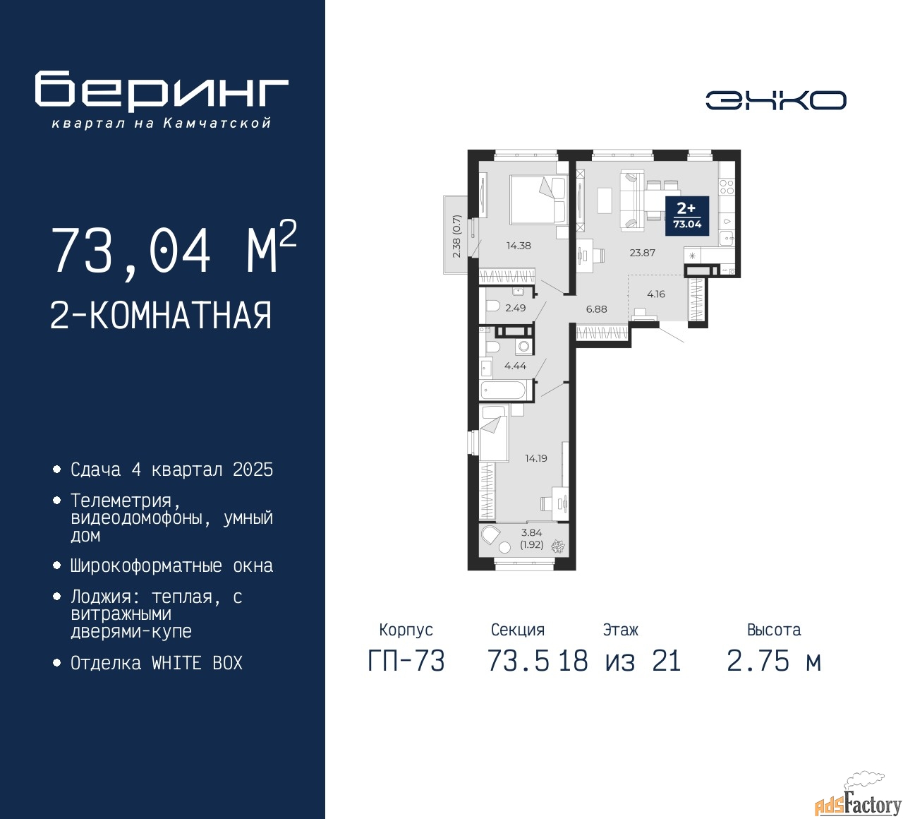 Дом монолитный, многоподъездный, переменной этажности, от 9 до 22 этажей. Квартира находится в 73.5-й секции высотой 21 этаж в корпусе ГП-73. На этаже 6 квартир. В подъезде 1 пассажирский и 1 грузовой лифт. Окончание строительства - 4 квартал 2025 года. Оформление сделки по договору долевого участия.