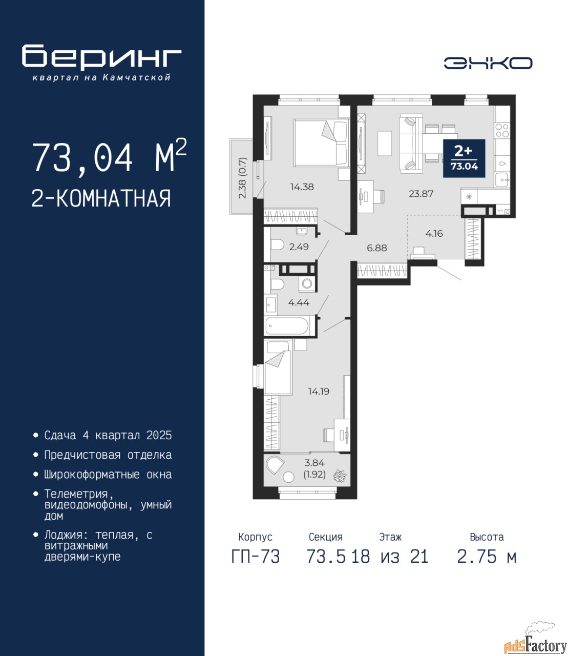 Дом монолитный, многоподъездный, переменной этажности, от 9 до 22 этажей. Квартира находится в 73.5-й секции высотой 21 этаж в корпусе ГП-73. На этаже 6 квартир. В подъезде 1 пассажирский и 1 грузовой лифт. Окончание строительства - 4 квартал 2025 года. Оформление сделки по договору долевого участия.