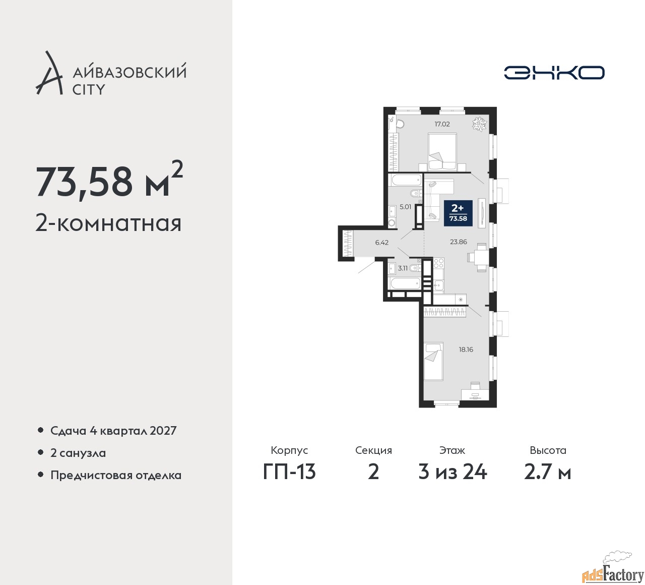 Дом монолитный, многоподъездный, высотой 24 этажа. Квартира находится во 2-й секции в корпусе ГП-13. На этаже 6 квартир. В подъезде 1 пассажирский и 1 грузовой лифт. Окончание строительства - 4 квартал 2027 года. Оформление сделки по договору долевого участия.