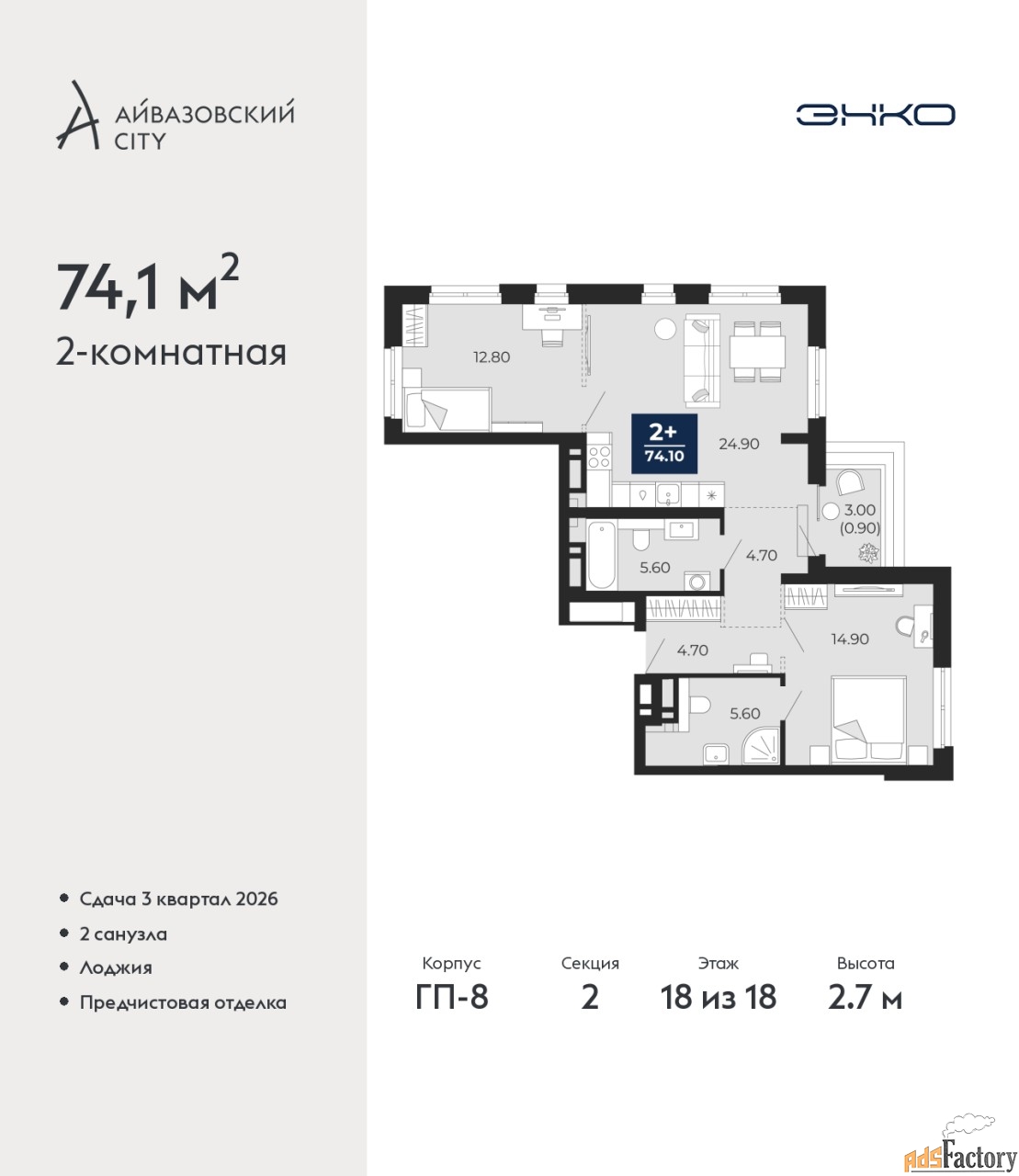 Дом монолитный, многоподъездный, переменной этажности, от 14 до 24 этажей. Квартира находится во 2-й секции высотой 18 этажей в корпусе ГП-8. На этаже 5 квартир. В подъезде 1 пассажирский и 1 грузовой лифт. Окончание строительства - 3 квартал 2026 года. Оформление сделки по договору долевого участия.