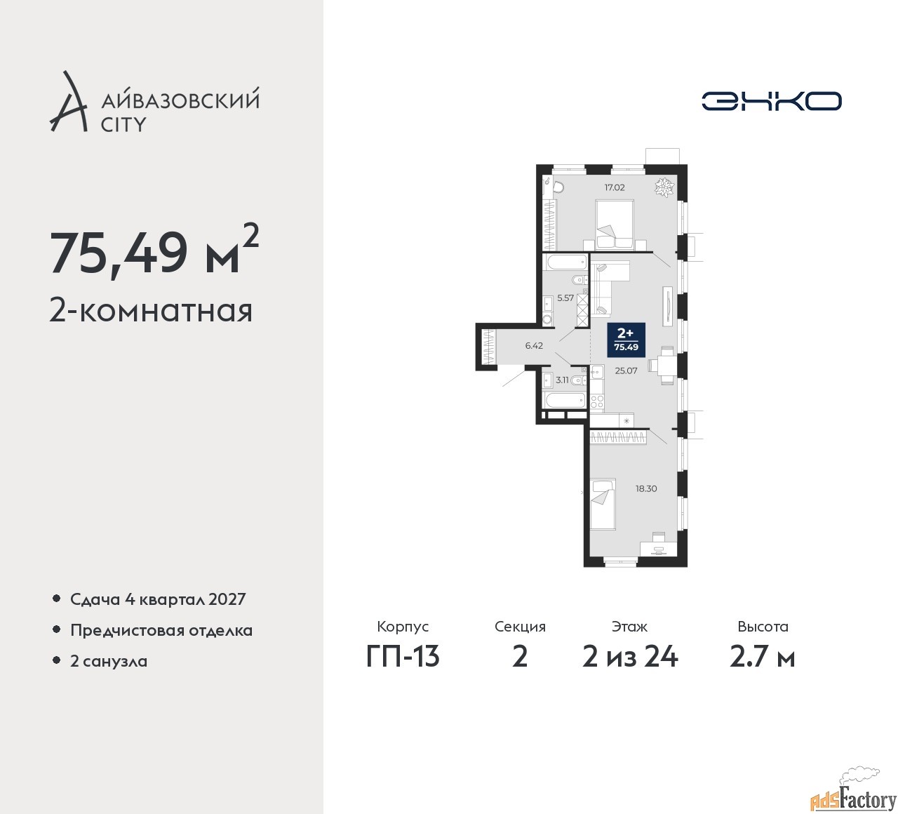 Дом монолитный, многоподъездный, высотой 24 этажа. Квартира находится во 2-й секции в корпусе ГП-13. На этаже 6 квартир. В подъезде 1 пассажирский и 1 грузовой лифт. Окончание строительства - 4 квартал 2027 года. Оформление сделки по договору долевого участия.