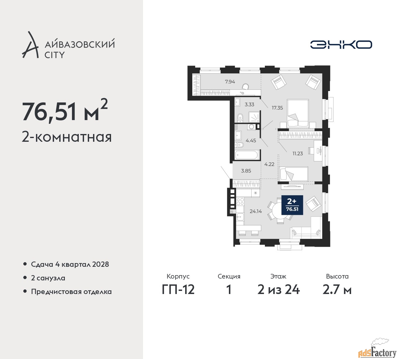 Дом монолитный, многоподъездный, высотой 24 этажа. Квартира находится в 1-й секции в корпусе ГП-12. На этаже 7 квартир. В подъезде 2 пассажирских и 1 грузовой лифт. Окончание строительства - 4 квартал 2028 года. Оформление сделки по договору долевого участия.