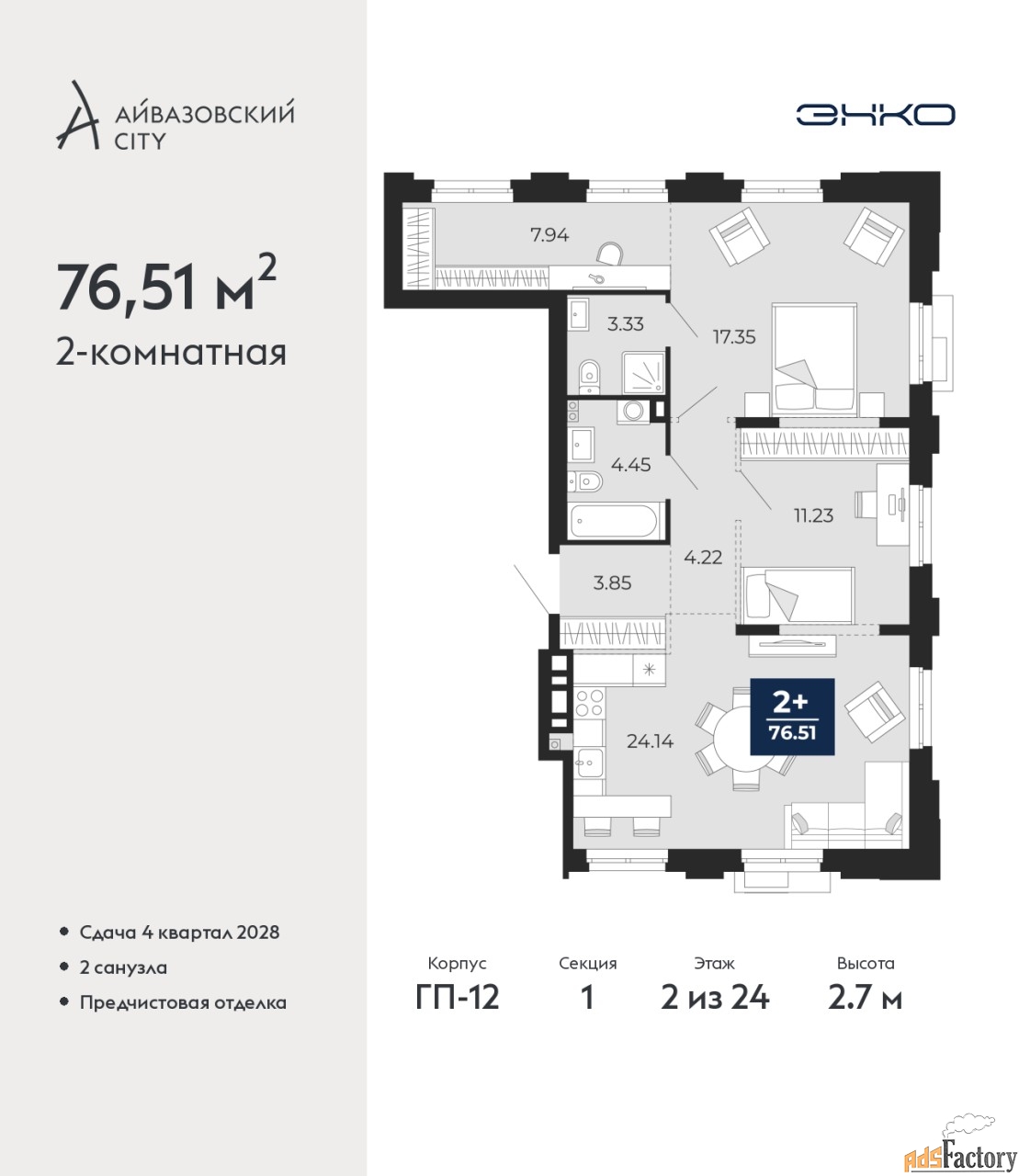 Дом монолитный, многоподъездный, высотой 24 этажа. Квартира находится в 1-й секции в корпусе ГП-12. На этаже 7 квартир. В подъезде 2 пассажирских и 1 грузовой лифт. Окончание строительства - 4 квартал 2028 года. Оформление сделки по договору долевого участия.
