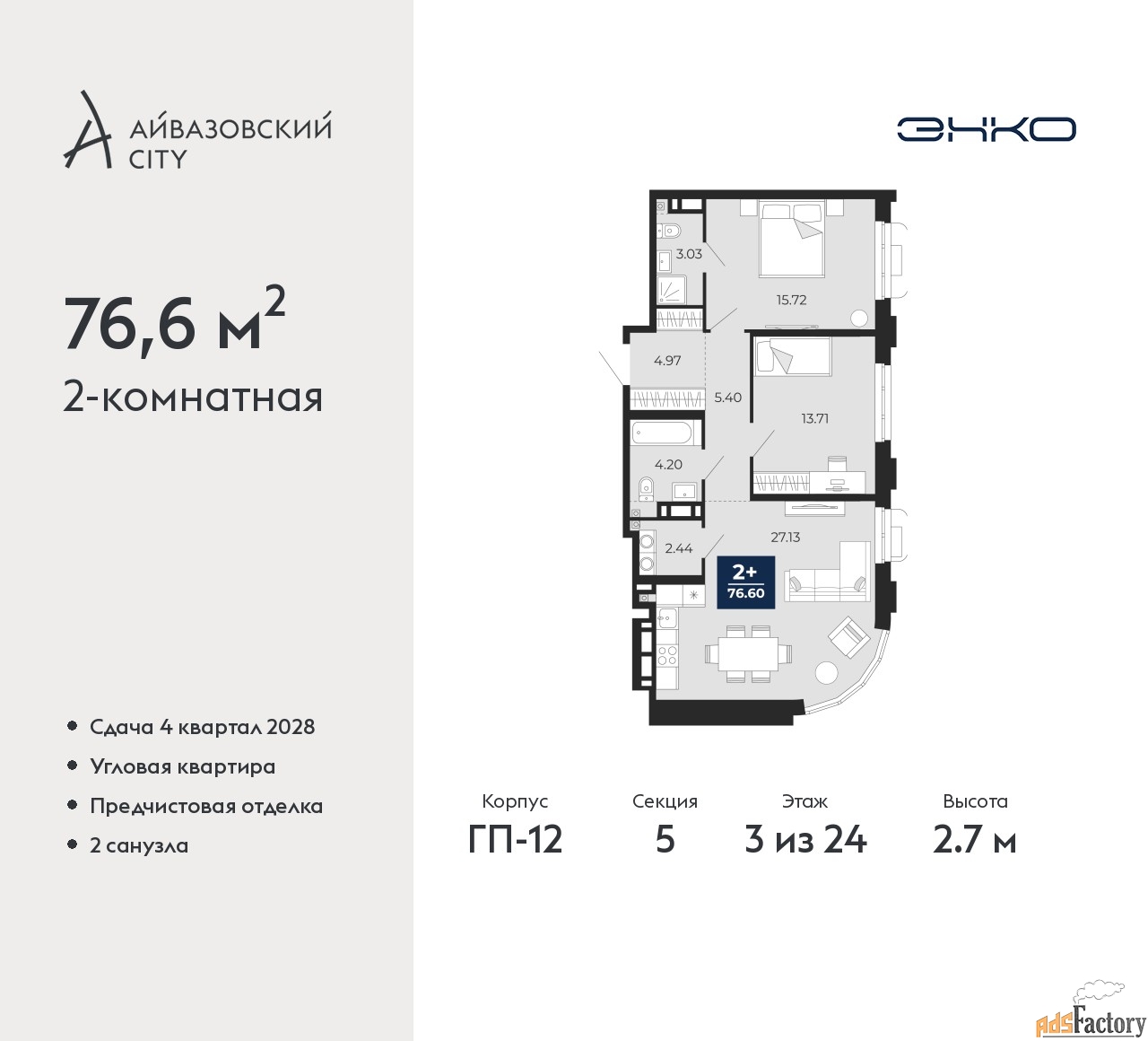 Дом монолитный, многоподъездный, высотой 24 этажа. Квартира находится в 5-й секции в корпусе ГП-12. На этаже 5 квартир. В подъезде 1 пассажирский и 1 грузовой лифт. Окончание строительства - 4 квартал 2028 года. Оформление сделки по договору долевого участия.
