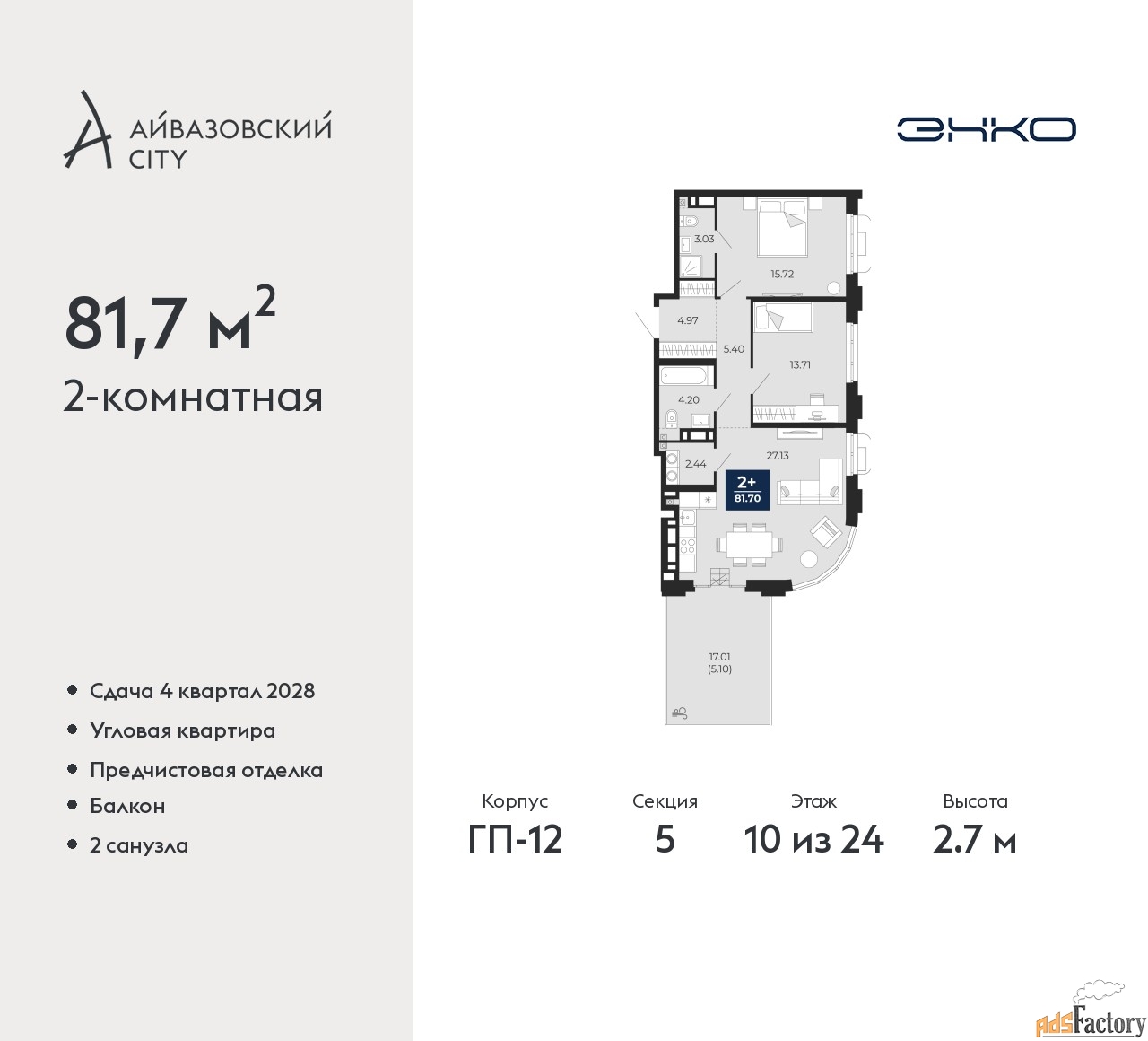 Дом монолитный, многоподъездный, высотой 24 этажа. Квартира находится в 5-й секции в корпусе ГП-12. На этаже 5 квартир. В подъезде 1 пассажирский и 1 грузовой лифт. Окончание строительства - 4 квартал 2028 года. Оформление сделки по договору долевого участия.