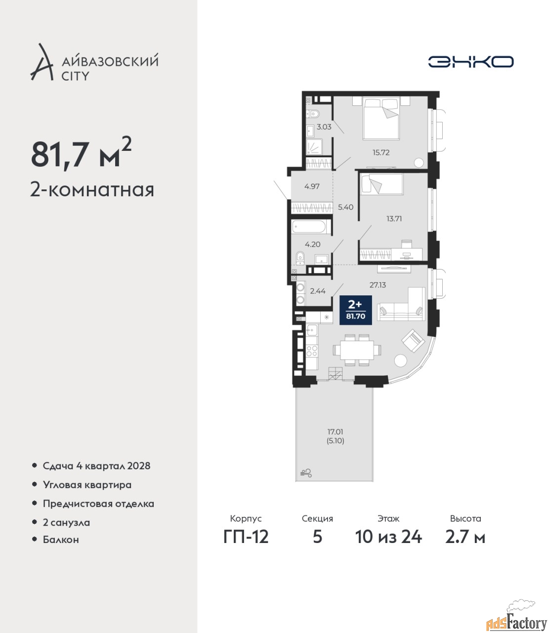 Дом монолитный, многоподъездный, высотой 24 этажа. Квартира находится в 5-й секции в корпусе ГП-12. На этаже 5 квартир. В подъезде 1 пассажирский и 1 грузовой лифт. Окончание строительства - 4 квартал 2028 года. Оформление сделки по договору долевого участия.