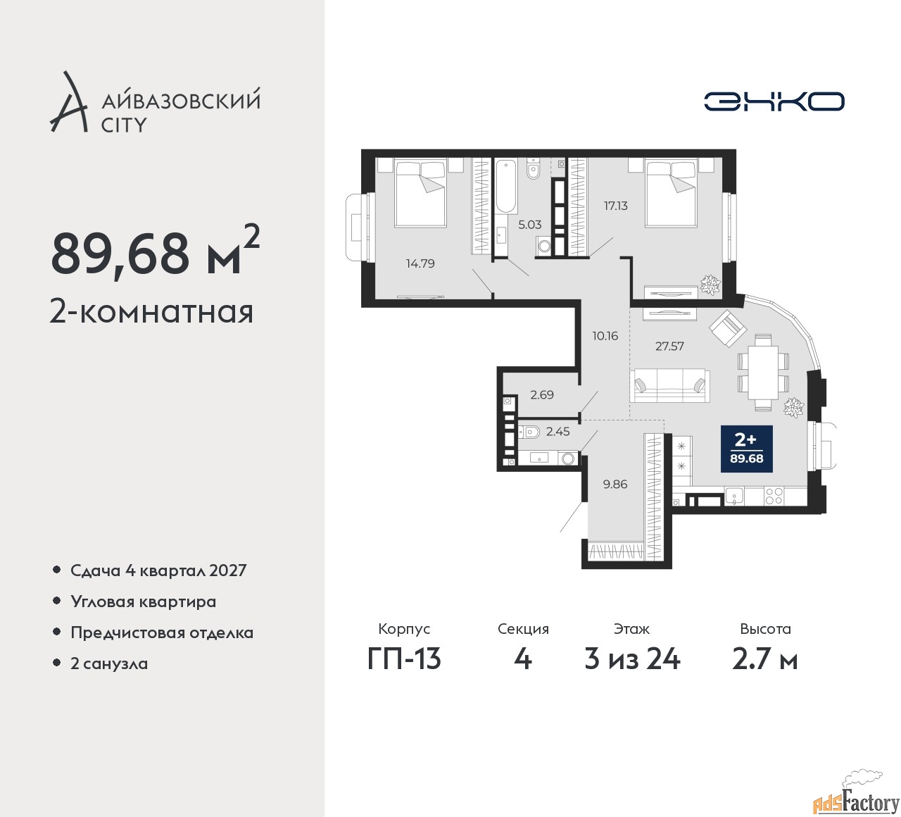 Дом монолитный, многоподъездный, высотой 24 этажа. Квартира находится в 4-й секции в корпусе ГП-13. На этаже 6 квартир. В подъезде 1 пассажирский и 1 грузовой лифт. Окончание строительства - 4 квартал 2027 года. Оформление сделки по договору долевого участия.