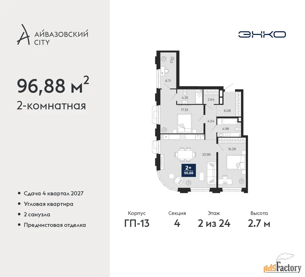 Дом монолитный, многоподъездный, высотой 24 этажа. Квартира находится в 4-й секции в корпусе ГП-13. На этаже 6 квартир. В подъезде 1 пассажирский и 1 грузовой лифт. Окончание строительства - 4 квартал 2027 года. Оформление сделки по договору долевого участия.