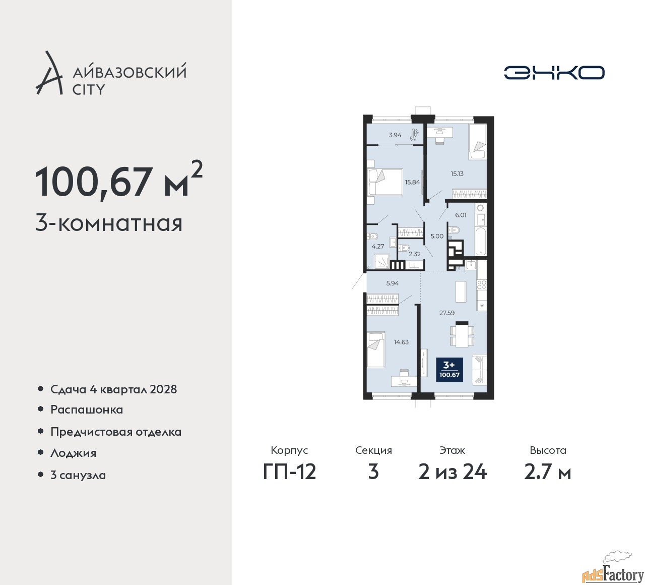 Дом монолитный, многоподъездный, высотой 24 этажа. Квартира находится в 3-й секции в корпусе ГП-12. На этаже 6 квартир. В подъезде 1 пассажирский и 1 грузовой лифт. Окончание строительства - 4 квартал 2028 года. Оформление сделки по договору долевого участия.