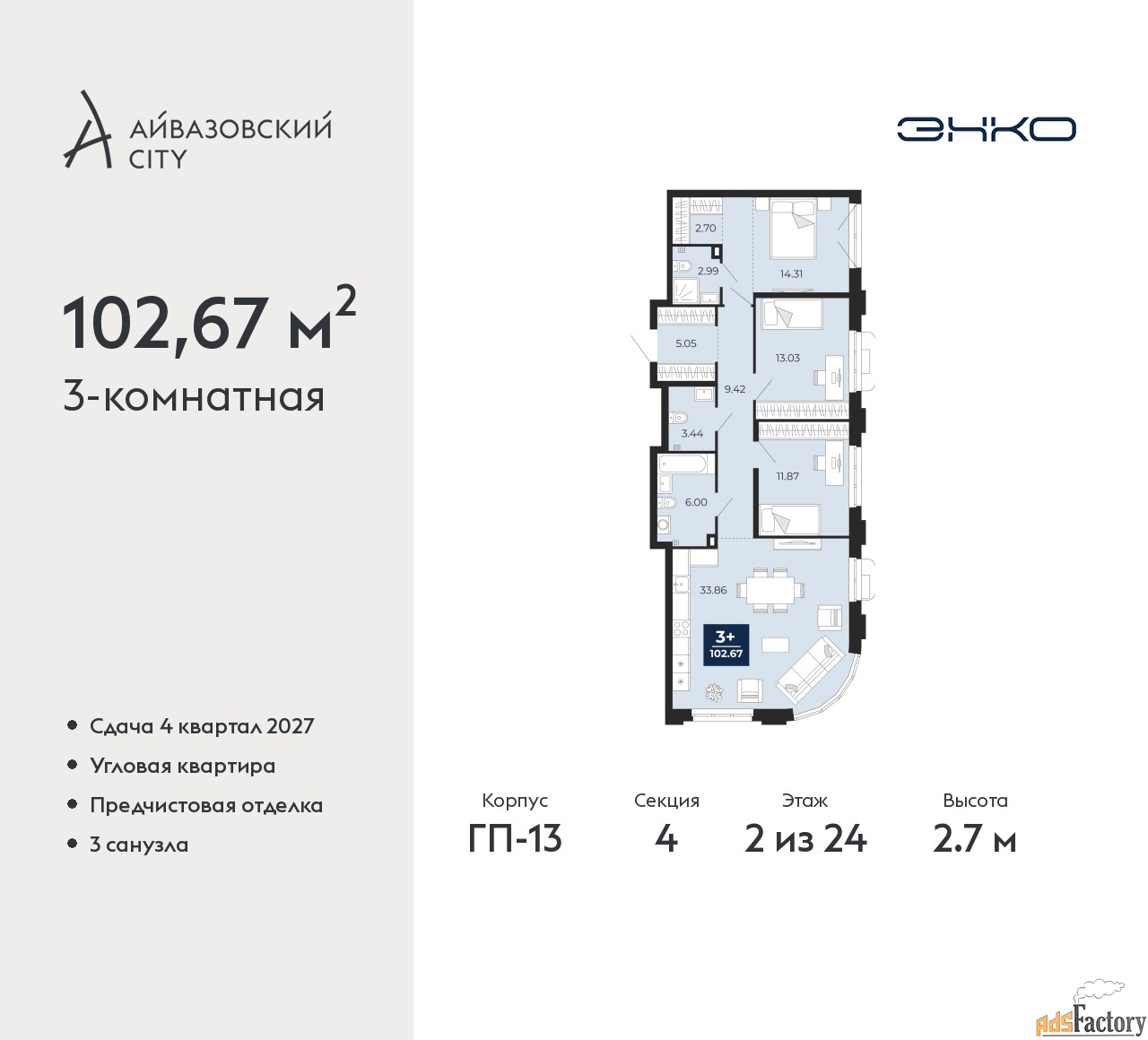 Дом монолитный, многоподъездный, высотой 24 этажа. Квартира находится в 4-й секции в корпусе ГП-13. На этаже 6 квартир. В подъезде 1 пассажирский и 1 грузовой лифт. Окончание строительства - 4 квартал 2027 года. Оформление сделки по договору долевого участия.