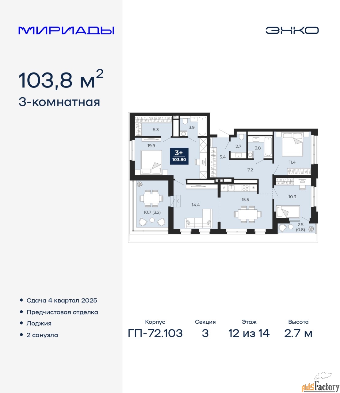 Дом монолитный, трехподъездный, переменной этажности, от 14 до 16 этажей. Квартира находится в 3-й секции высотой 14 этажей в корпусе ГП-72.103. На этаже 8 квартир. В подъезде 1 пассажирский и 1 грузовой лифт. Окончание строительства - 1 квартал 2026 года. Оформление сделки по договору долевого участия.