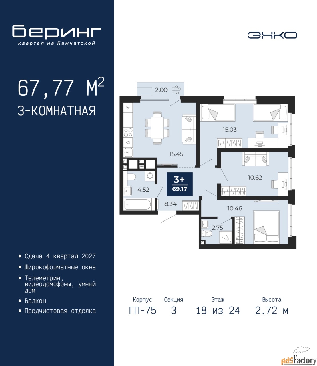 | Высота потолков (м.) | 2.72 |