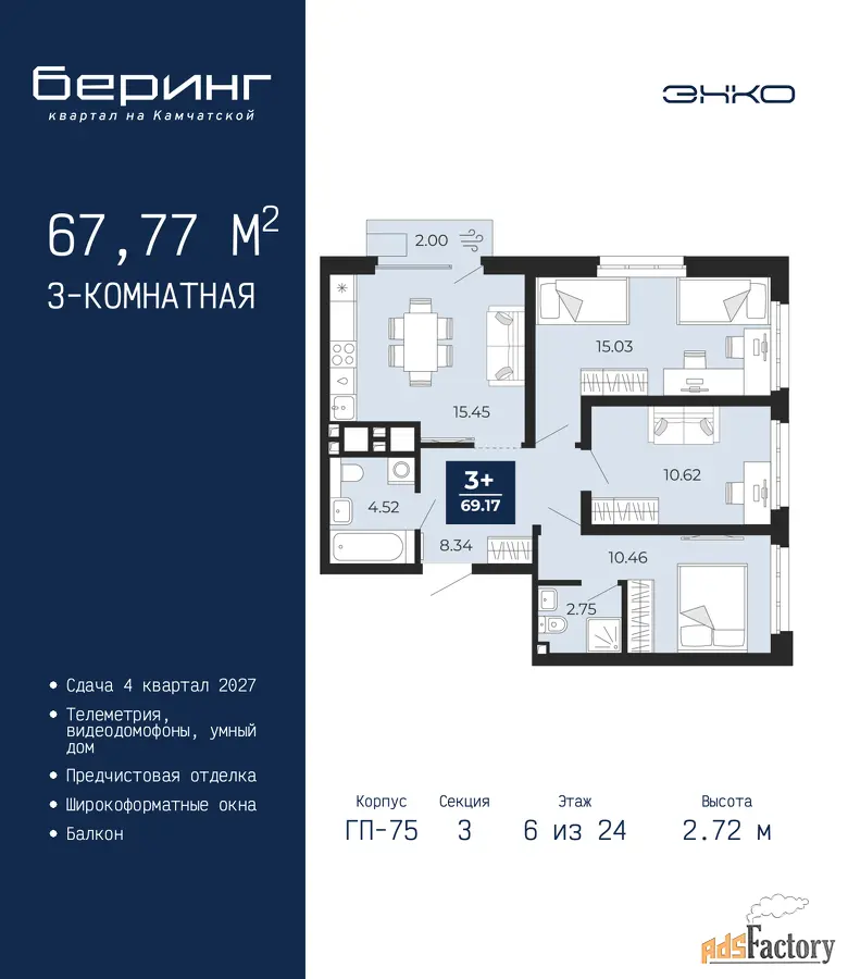 | Высота потолков (м.) | 2.72 |