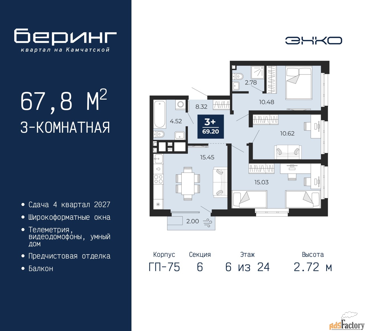 Дом монолитный, многоподъездный, переменной этажности, от 17 до 24 этажей. Квартира находится в 6-й секции высотой 24 этажа в корпусе ГП-75. На этаже 6 квартир. В подъезде 2 пассажирских и 1 грузовой лифт. Окончание строительства - 4 квартал 2027 года. Оформление сделки по договору долевого участия.
