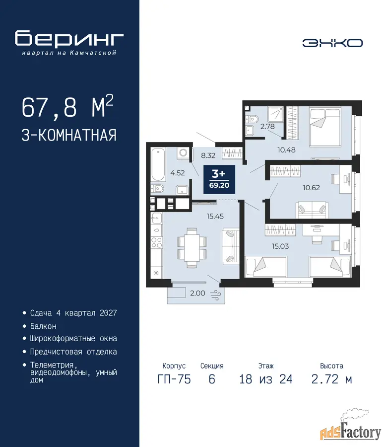 Дом монолитный, многоподъездный, переменной этажности, от 17 до 24 этажей. Квартира находится в 6-й секции высотой 24 этажа в корпусе ГП-75. На этаже 6 квартир. В подъезде 2 пассажирских и 1 грузовой лифт. Окончание строительства - 4 квартал 2027 года. Оформление сделки по договору долевого участия.