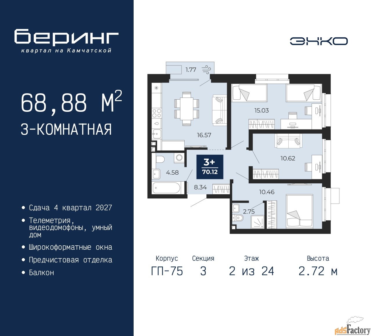 Дом монолитный, многоподъездный, переменной этажности, от 17 до 24 этажей. Квартира находится в 3-й секции высотой 24 этажа в корпусе ГП-75. На этаже 6 квартир. В подъезде 2 пассажирских и 1 грузовой лифт. Окончание строительства - 4 квартал 2027 года. Оформление сделки по договору долевого участия.