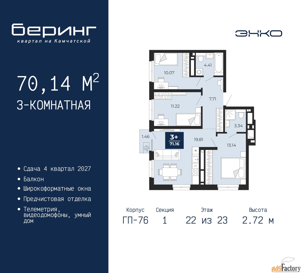 Дом монолитный, черырехподъездный, переменной этажности, от 19 до 24 этажей. Квартира находится в 1-й секции высотой 23 этажа в корпусе ГП-76. На этаже 7 квартир. В подъезде 2 пассажирских и 1 грузовой лифт. Окончание строительства - 4 квартал 2027 года. Оформление сделки по договору долевого участия.
