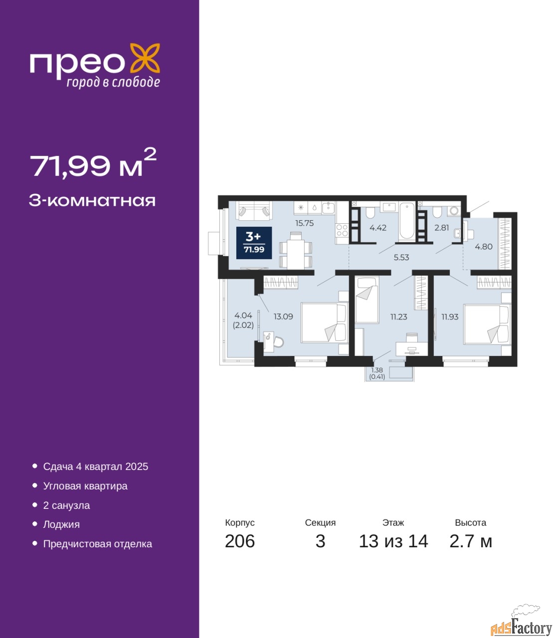 Дом монолитный, трехподъездный, переменной этажности, от 14 до 23 этажей. Квартира находится в 3-й секции высотой 14 этажей в корпусе 206. На этаже 6 квартир. В подъезде 1 пассажирский и 1 грузовой лифт. Окончание строительства - 4 квартал 2025 года. Оформление сделки по договору долевого участия.