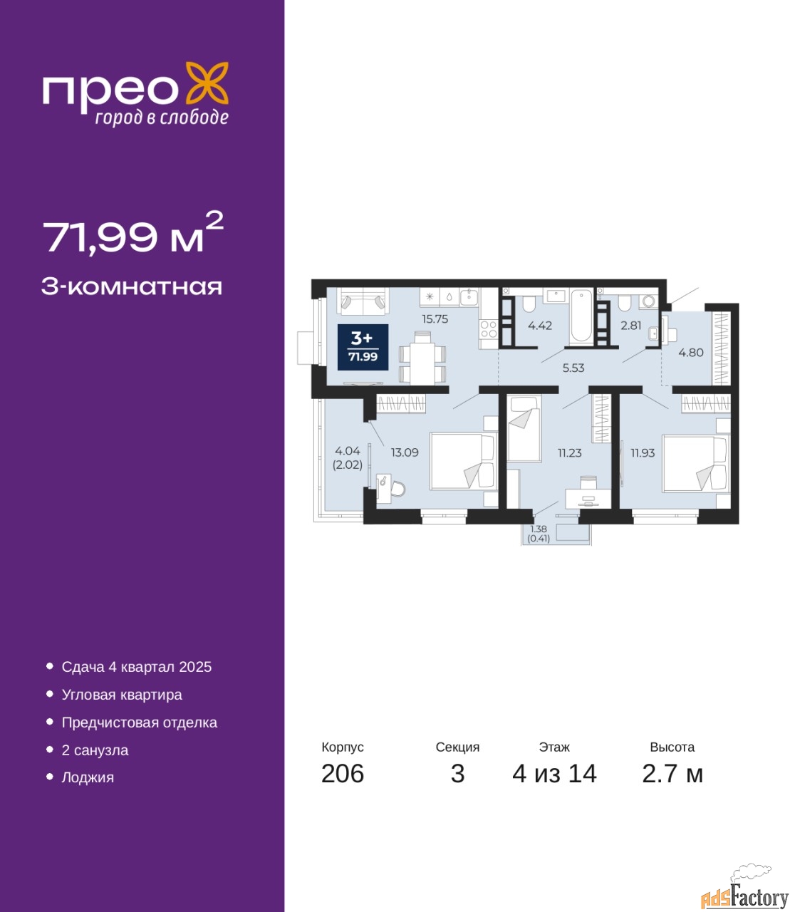 Дом монолитный, трехподъездный, переменной этажности, от 14 до 23 этажей. Квартира находится в 3-й секции высотой 14 этажей в корпусе 206. На этаже 6 квартир. В подъезде 1 пассажирский и 1 грузовой лифт. Окончание строительства - 4 квартал 2025 года. Оформление сделки по договору долевого участия.