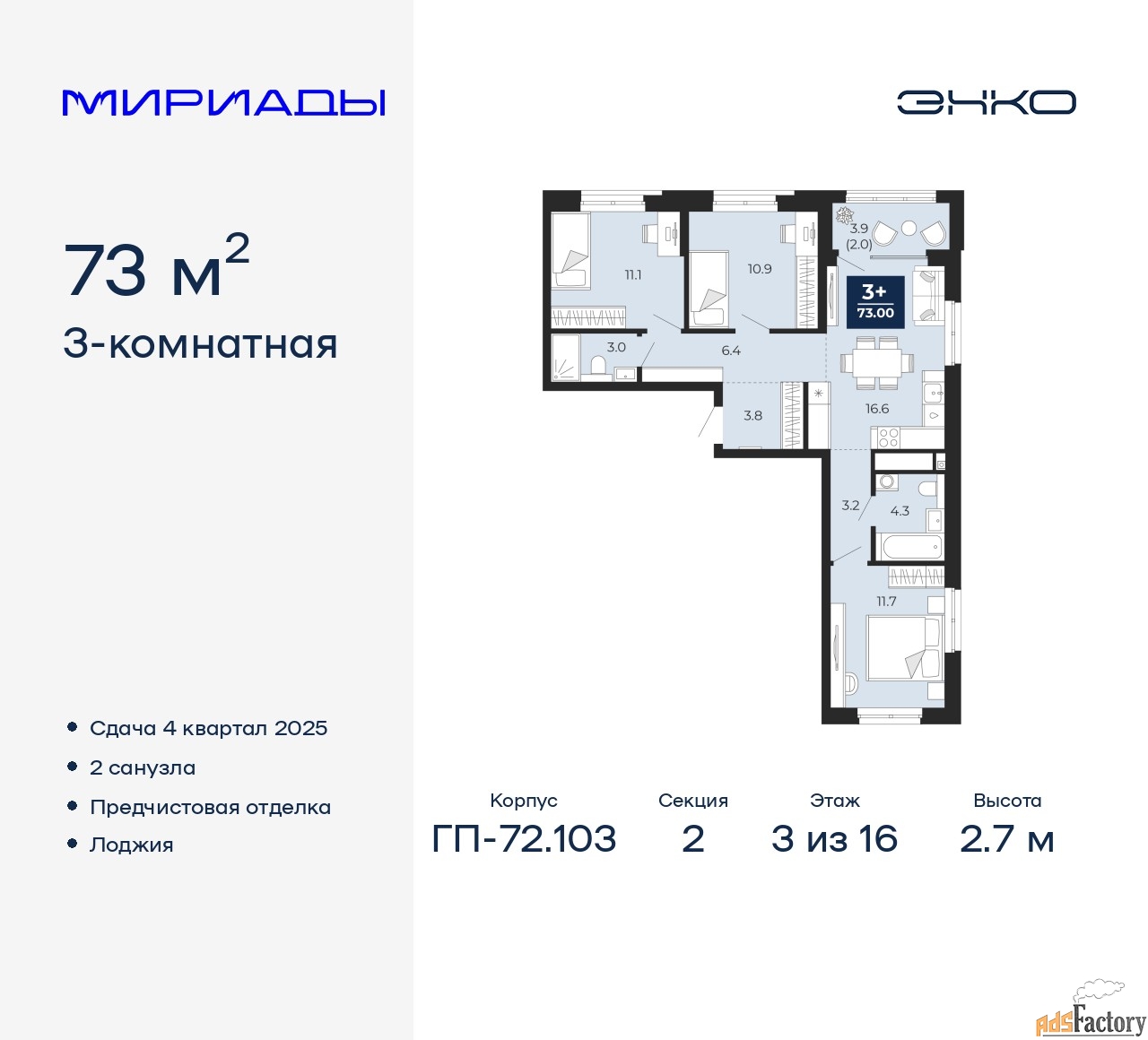 Дом монолитный, трехподъездный, переменной этажности, от 14 до 16 этажей. Квартира находится во 2-й секции высотой 16 этажей в корпусе ГП-72.103. На этаже 6 квартир. В подъезде 1 пассажирский и 1 грузовой лифт. Окончание строительства - 4 квартал 2025 года. Оформление сделки по договору долевого участия.