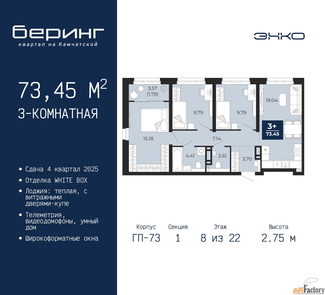 Дом монолитный, многоподъездный, переменной этажности, от 9 до 22 этажей. Квартира находится в 1-й секции высотой 22 этажа в корпусе ГП-73. На этаже 5 квартир. В подъезде 1 пассажирский и 1 грузовой лифт. Окончание строительства - 4 квартал 2025 года. Оформление сделки по договору долевого участия.