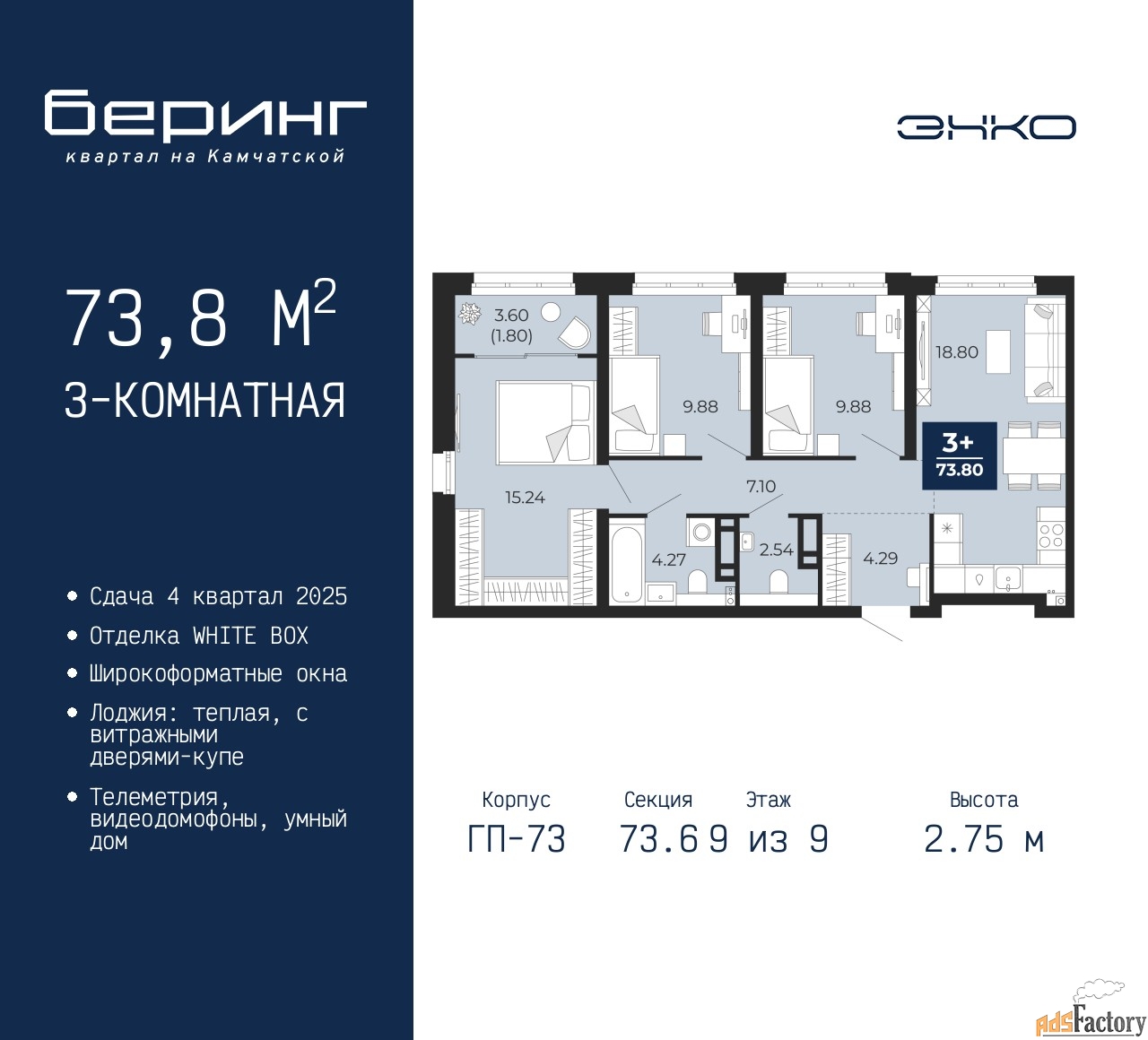 Дом монолитный, многоподъездный, переменной этажности, от 9 до 22 этажей. Квартира находится в 73.6-й секции высотой 9 этажей в корпусе ГП-73. На этаже 5 квартир. В подъезде 1 пассажирский и 1 грузовой лифт. Окончание строительства - 4 квартал 2025 года. Оформление сделки по договору долевого участия.