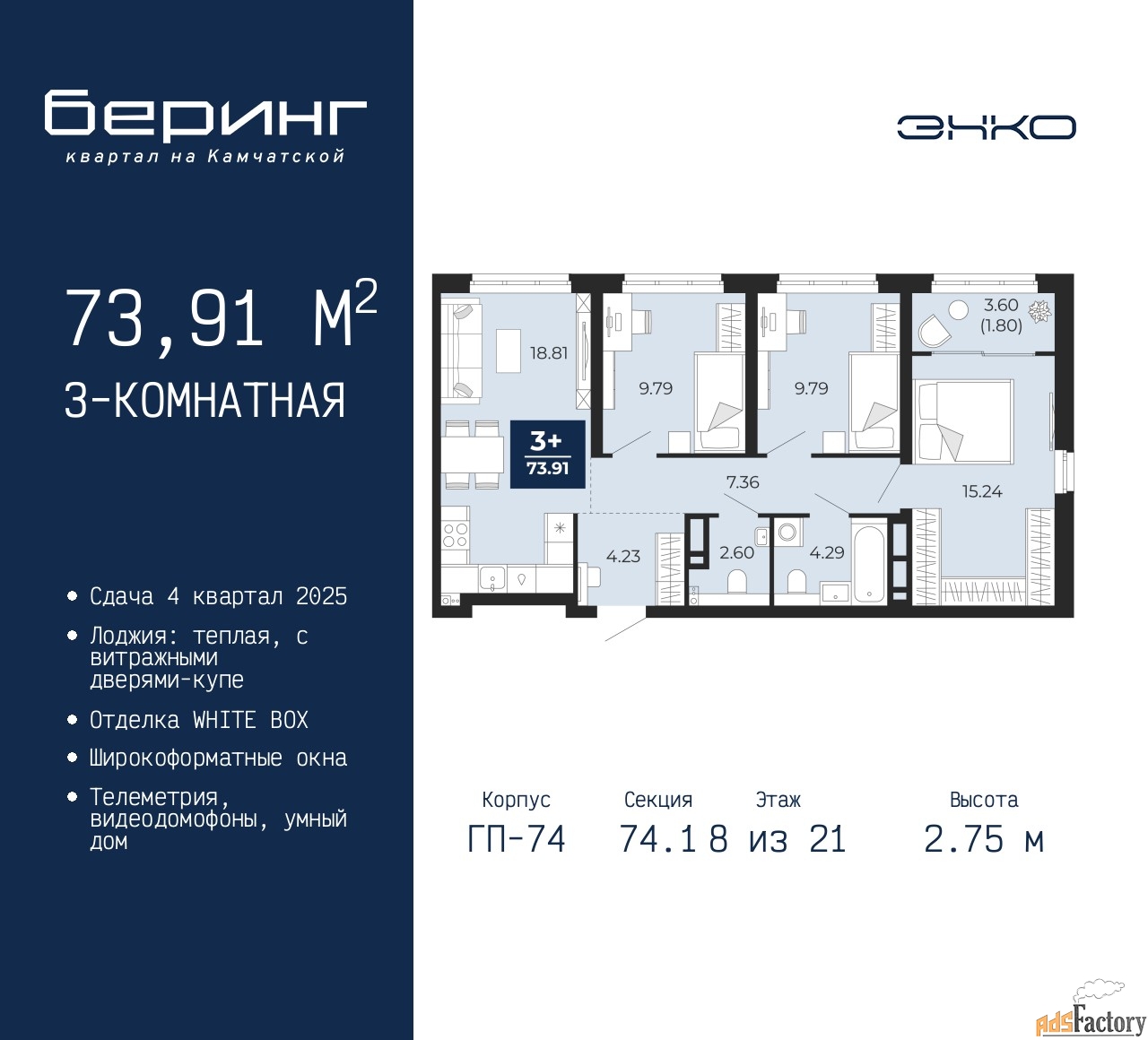 Дом монолитный, многоподъездный, переменной этажности, от 9 до 21 этажей. Квартира находится в 74.1-й секции высотой 21 этаж в корпусе ГП-74. На этаже 5 квартир. В подъезде 1 грузовой лифт. Окончание строительства - 4 квартал 2025 года. Оформление сделки по договору долевого участия.