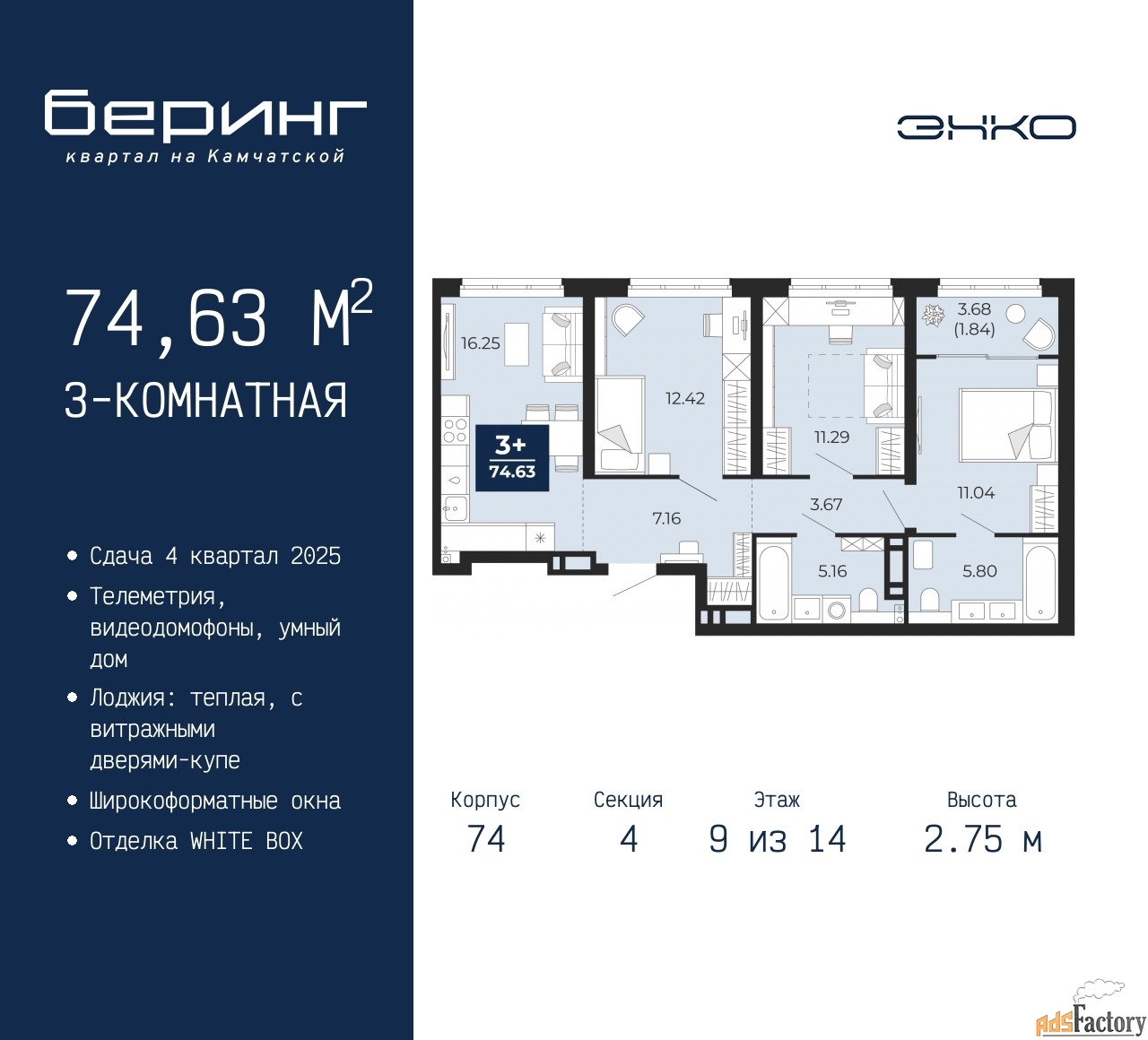 Дом монолитный, многоподъездный, переменной этажности, от 9 до 21 этажей. Квартира находится в 4-й секции высотой 14 этажей в корпусе ГП-74. На этаже 7 квартир. В подъезде 1 пассажирский и 1 грузовой лифт. Окончание строительства - 4 квартал 2025 года. Оформление сделки по договору долевого участия.