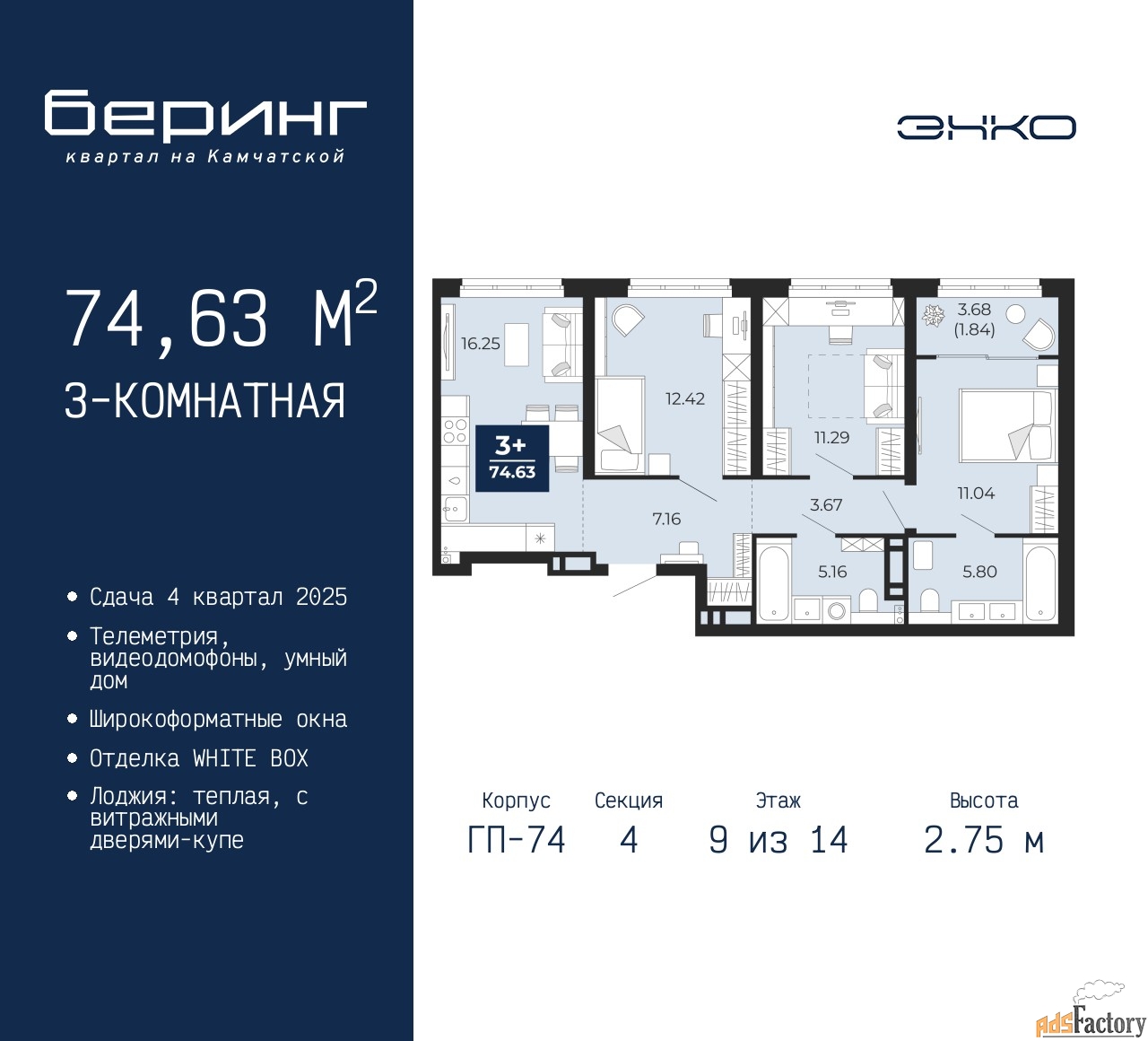 Дом монолитный, многоподъездный, переменной этажности, от 9 до 21 этажей. Квартира находится в 4-й секции высотой 14 этажей в корпусе ГП-74. На этаже 7 квартир. В подъезде 1 пассажирский и 1 грузовой лифт. Окончание строительства - 4 квартал 2025 года. Оформление сделки по договору долевого участия.