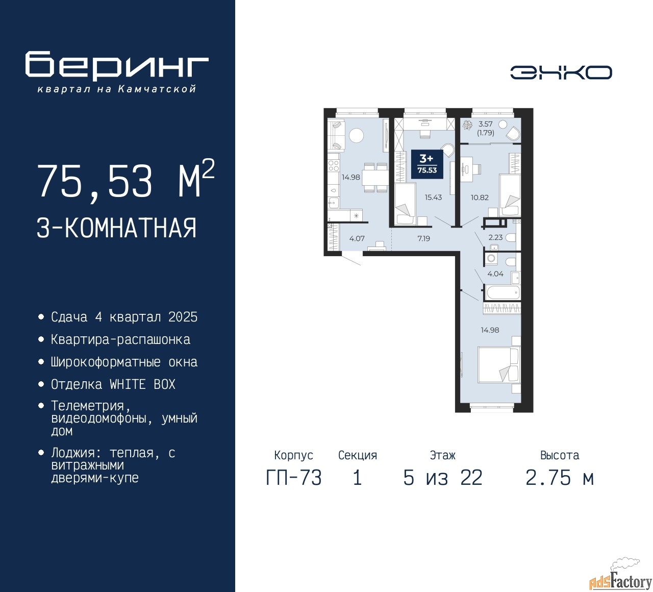 Дом монолитный, многоподъездный, переменной этажности, от 9 до 22 этажей. Квартира находится в 1-й секции высотой 22 этажа в корпусе ГП-73. На этаже 5 квартир. В подъезде 1 пассажирский и 1 грузовой лифт. Окончание строительства - 4 квартал 2025 года. Оформление сделки по договору долевого участия.