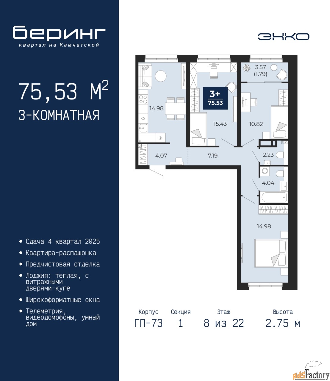 Дом монолитный, многоподъездный, переменной этажности, от 9 до 22 этажей. Квартира находится в 1-й секции высотой 22 этажа в корпусе ГП-73. На этаже 5 квартир. В подъезде 1 пассажирский и 1 грузовой лифт. Окончание строительства - 1 квартал 2026 года. Оформление сделки по договору долевого участия.