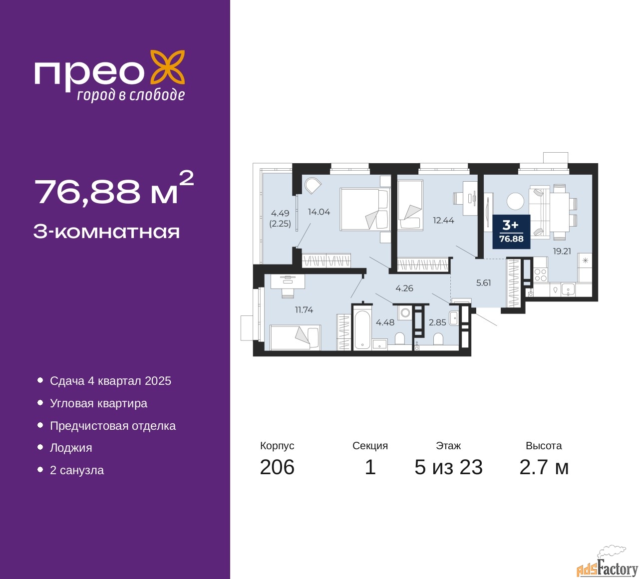 Дом монолитный, трехподъездный, переменной этажности, от 14 до 23 этажей. Квартира находится в 1-й секции высотой 23 этажа в корпусе 206. На этаже 8 квартир. В подъезде 1 пассажирский и 1 грузовой лифт. Окончание строительства - 4 квартал 2025 года. Оформление сделки по договору долевого участия.