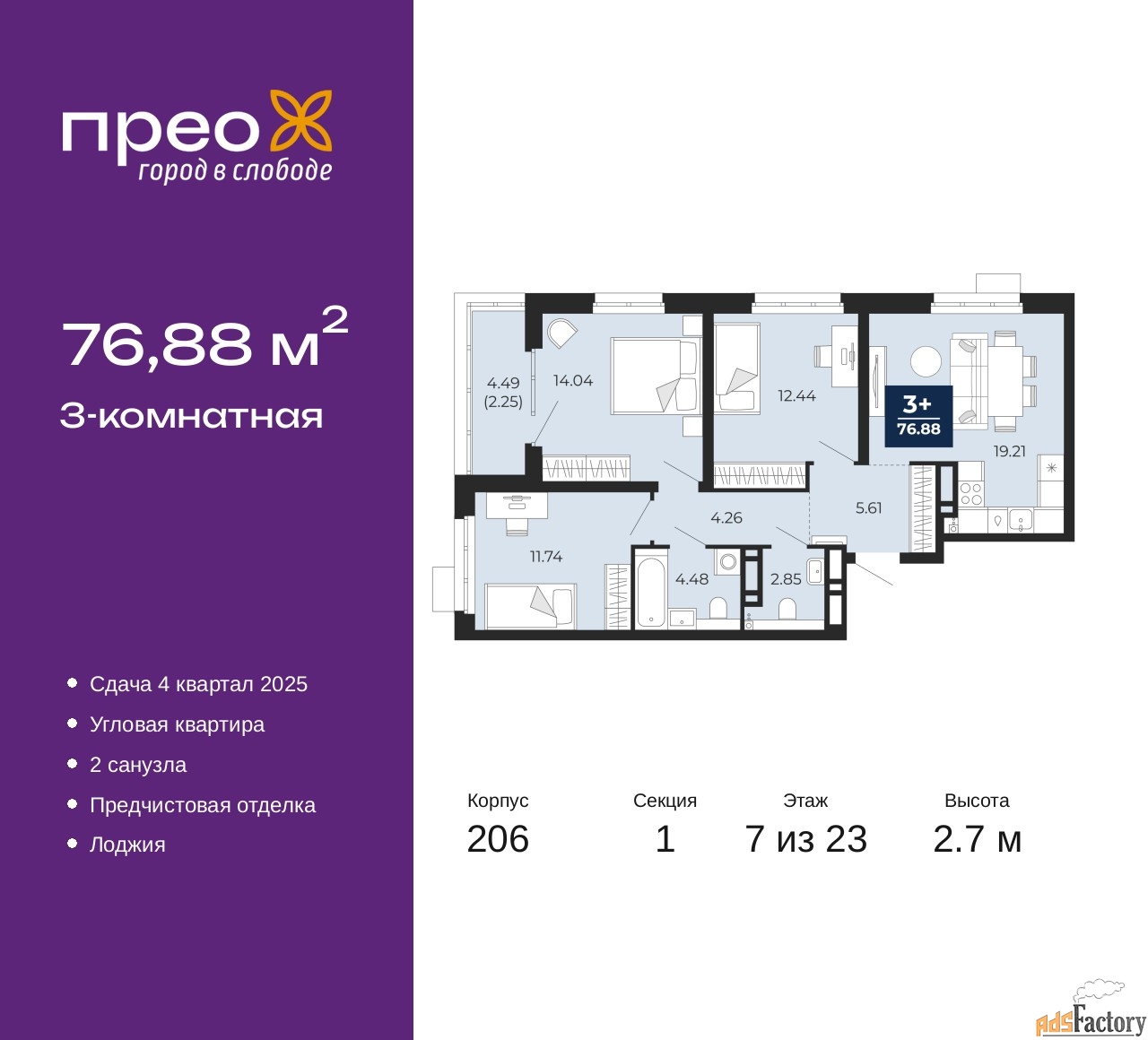 Дом монолитный, трехподъездный, переменной этажности, от 14 до 23 этажей. Квартира находится в 1-й секции высотой 23 этажа в корпусе 206. На этаже 8 квартир. В подъезде 1 пассажирский и 1 грузовой лифт. Окончание строительства - 4 квартал 2025 года. Оформление сделки по договору долевого участия.