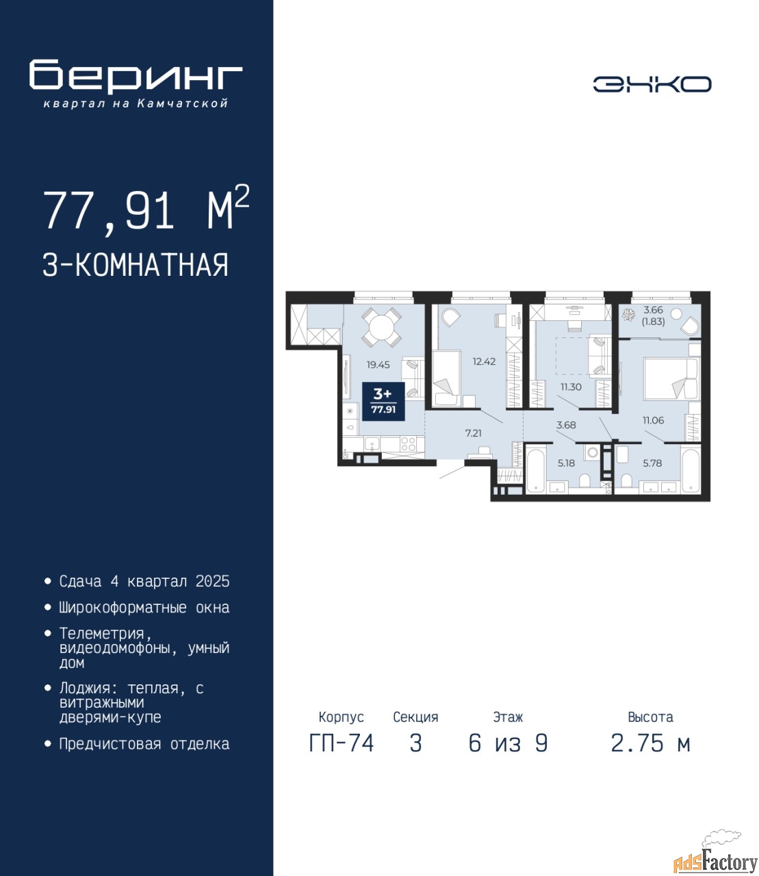 Дом монолитный, многоподъездный, переменной этажности, от 9 до 21 этажей. Квартира находится в 3-й секции высотой 9 этажей в корпусе ГП-74. На этаже 7 квартир. В подъезде 1 грузовой лифт. Окончание строительства - 4 квартал 2025 года. Оформление сделки по договору долевого участия.