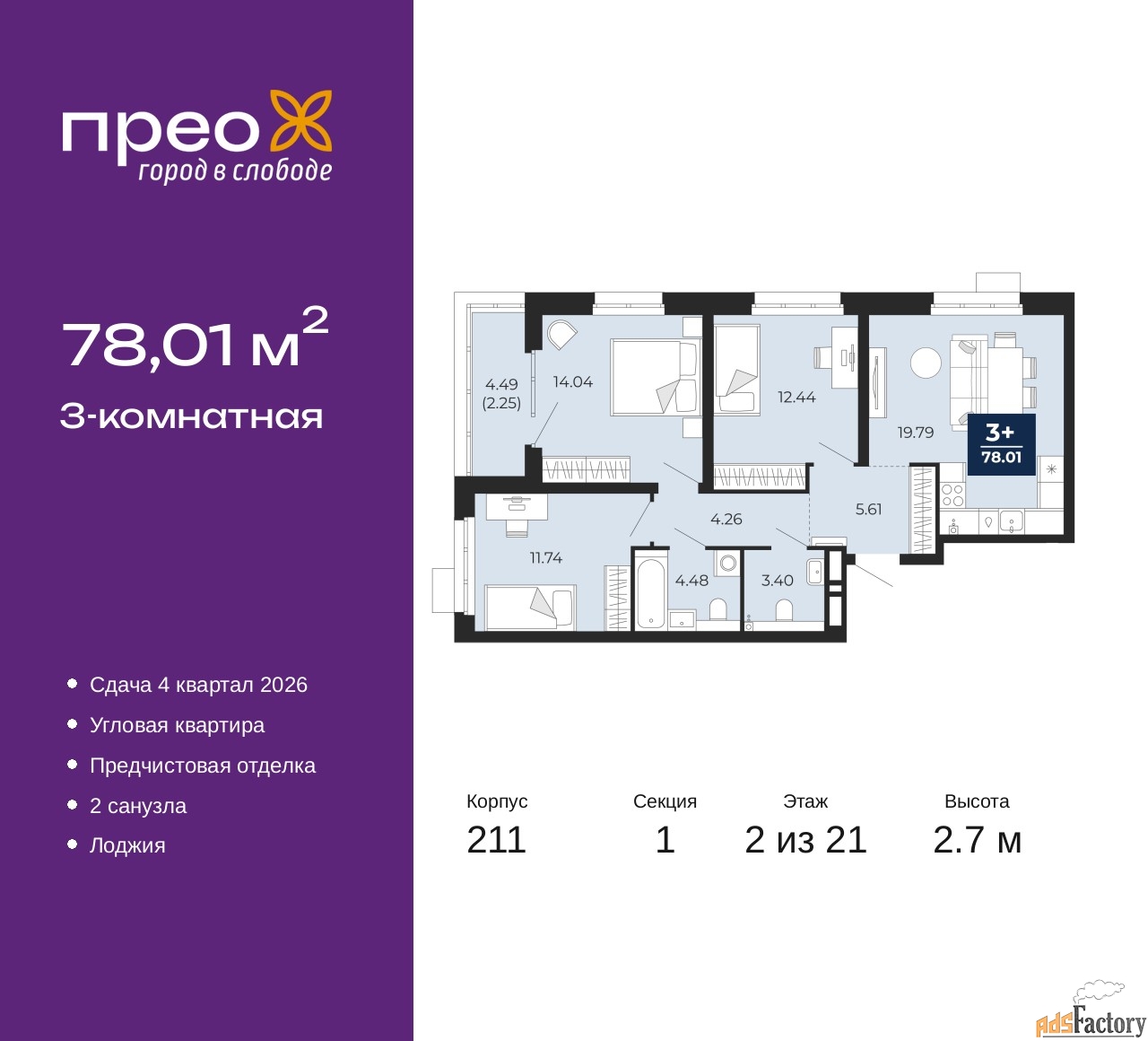 Дом монолитный, черырехподъездный, переменной этажности, от 14 до 21 этажей. Квартира находится в 1-й секции высотой 21 этаж в корпусе 211. На этаже 8 квартир. В подъезде 1 пассажирский и 1 грузовой лифт. Окончание строительства - 4 квартал 2026 года. Оформление сделки по договору долевого участия.