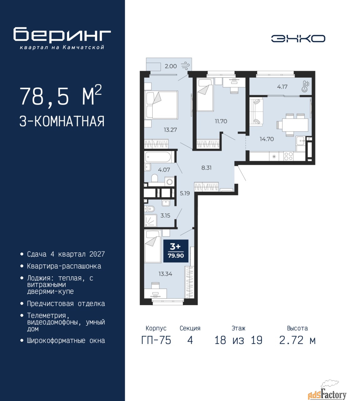 Дом монолитный, многоподъездный, переменной этажности, от 17 до 24 этажей. Квартира находится в 4-й секции высотой 19 этажей в корпусе ГП-75. На этаже 4 квартиры. В подъезде 2 пассажирских и 1 грузовой лифт. Окончание строительства - 4 квартал 2027 года. Оформление сделки по договору долевого участия.