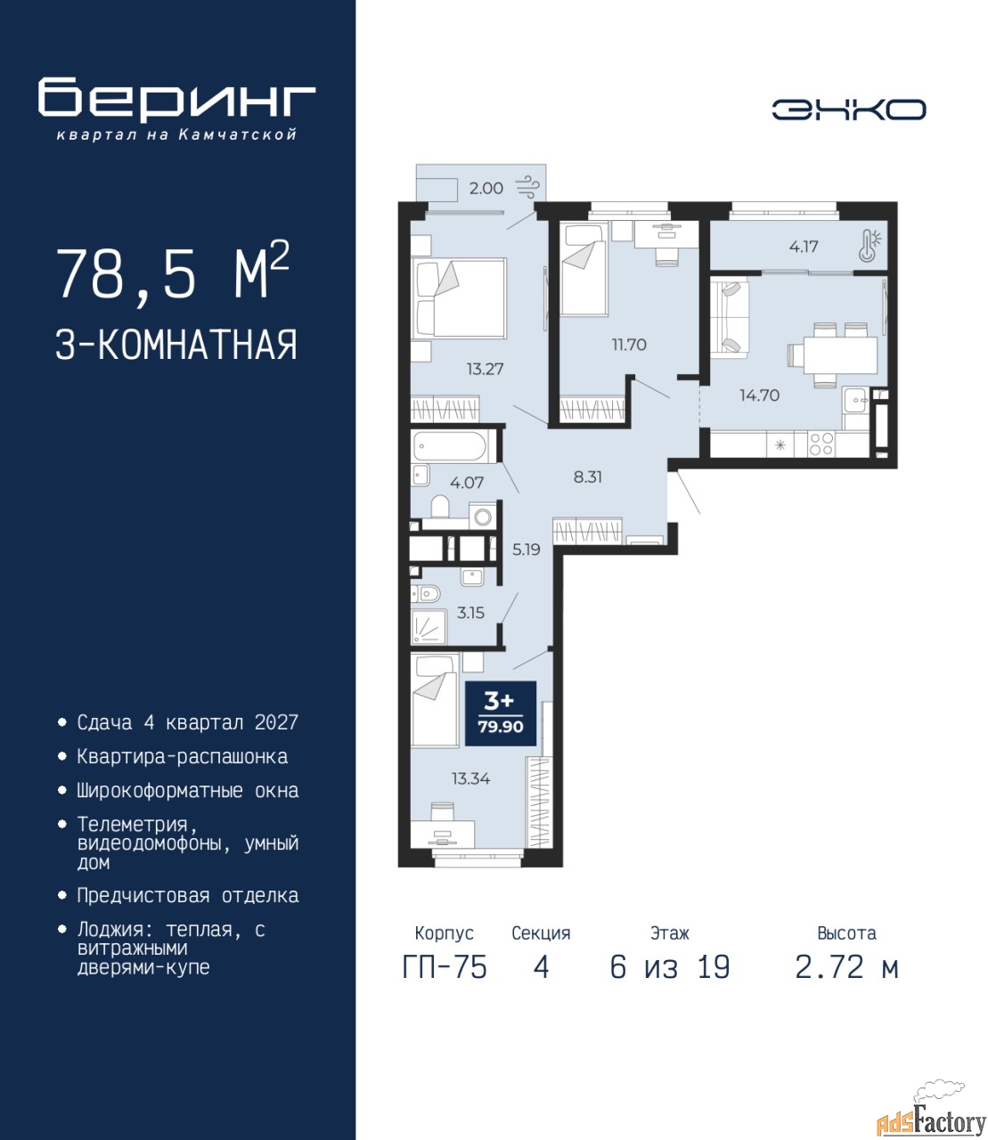 Дом монолитный, многоподъездный, переменной этажности, от 17 до 24 этажей. Квартира находится в 4-й секции высотой 19 этажей в корпусе ГП-75. На этаже 4 квартиры. В подъезде 2 пассажирских и 1 грузовой лифт. Окончание строительства - 4 квартал 2027 года. Оформление сделки по договору долевого участия.