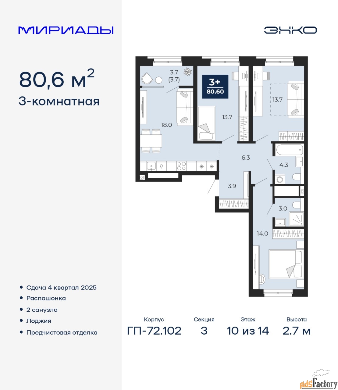 Дом монолитный, многоподъездный, переменной этажности, от 14 до 16 этажей. Квартира находится в 3-й секции высотой 14 этажей в корпусе ГП-72.102. На этаже 5 квартир. В подъезде 1 пассажирский и 1 грузовой лифт. Окончание строительства - 1 квартал 2026 года. Оформление сделки по договору долевого участия.