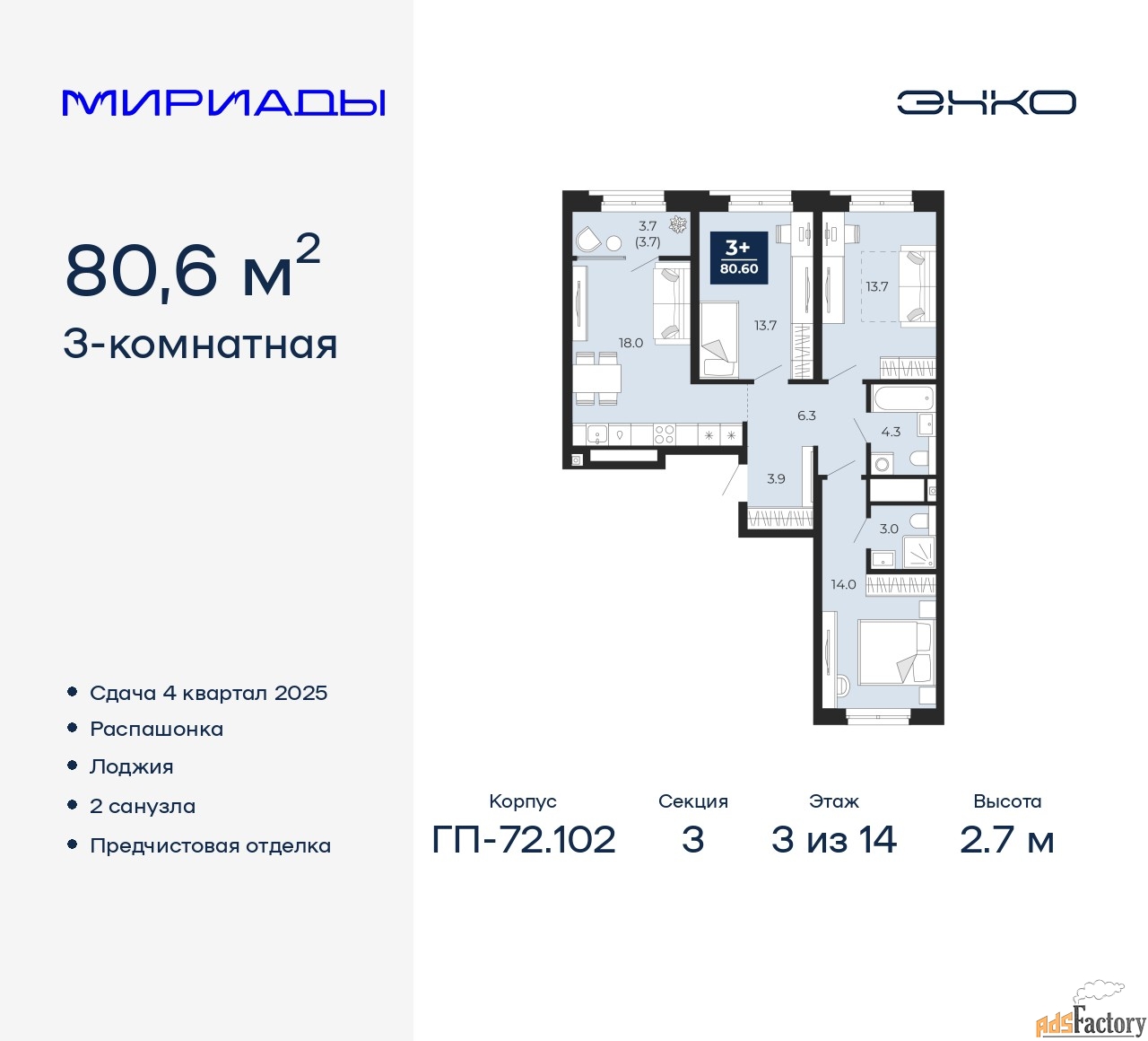 Дом монолитный, многоподъездный, переменной этажности, от 14 до 16 этажей. Квартира находится в 3-й секции высотой 14 этажей в корпусе ГП-72.102. На этаже 5 квартир. В подъезде 1 пассажирский и 1 грузовой лифт. Окончание строительства - 4 квартал 2025 года. Оформление сделки по договору долевого участия.
