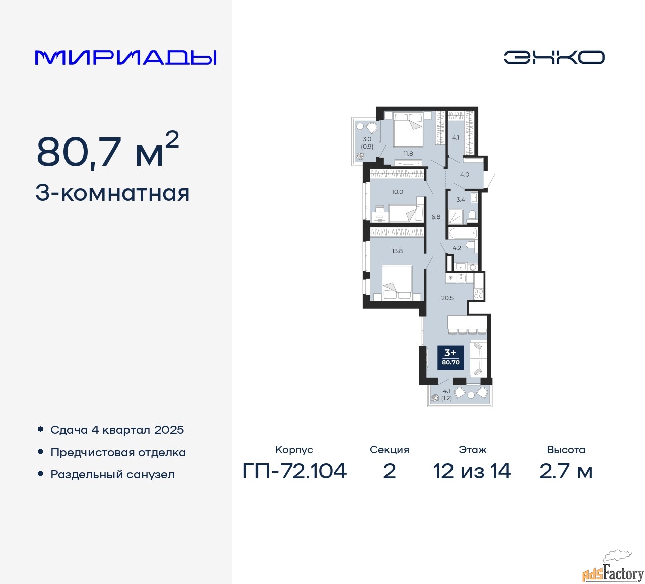 Дом монолитный, двухподъездный, переменной этажности, от 14 до 18 этажей. Квартира находится во 2-й секции высотой 14 этажей в корпусе ГП-72.104. На этаже 8 квартир. В подъезде 1 пассажирский и 1 грузовой лифт. Окончание строительства - 4 квартал 2025 года. Оформление сделки по договору долевого участия.